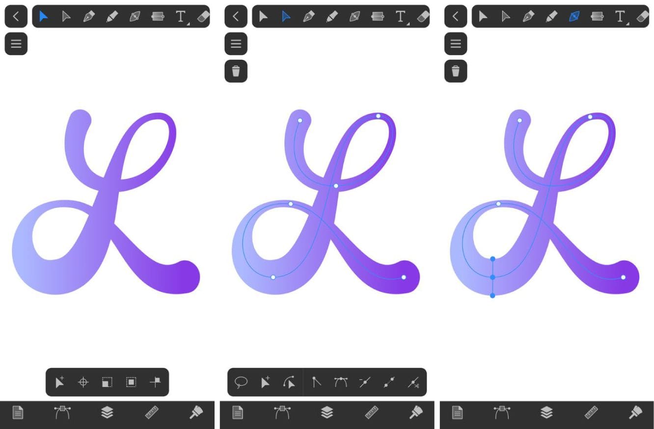 No caso de designers gráficos ou artistas de lettering, que trabalham essencialmente com o Illustrator, Amadine é uma versão acessível, tornando assim a sua primeira utilização uma experiência de grande fluidez — nos primeiros instantes de contacto com a aplicação, desenhei e editei a letra L em estilo cursivo, que pude tanto alterar a sua forma, como escolher diferentes espessuras para a linha, algo que não é possível fazer facilmente ou com tanta destreza no Illustrator.