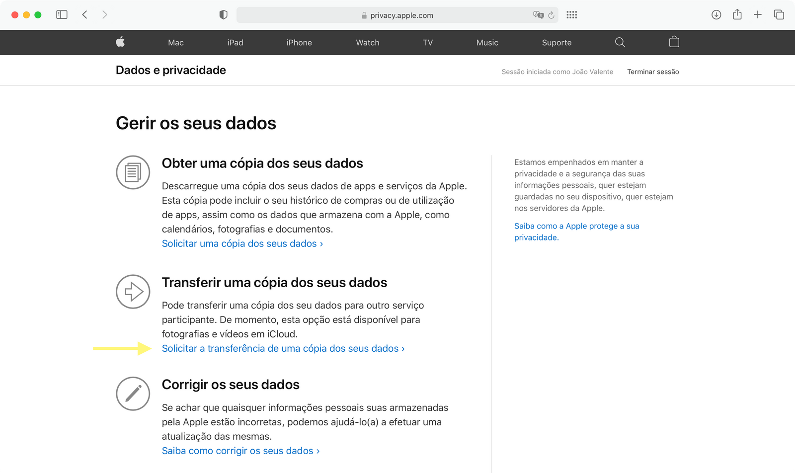 - Acede á tua página de Dados e Privacidade e inicia sessão na tua conta Apple;