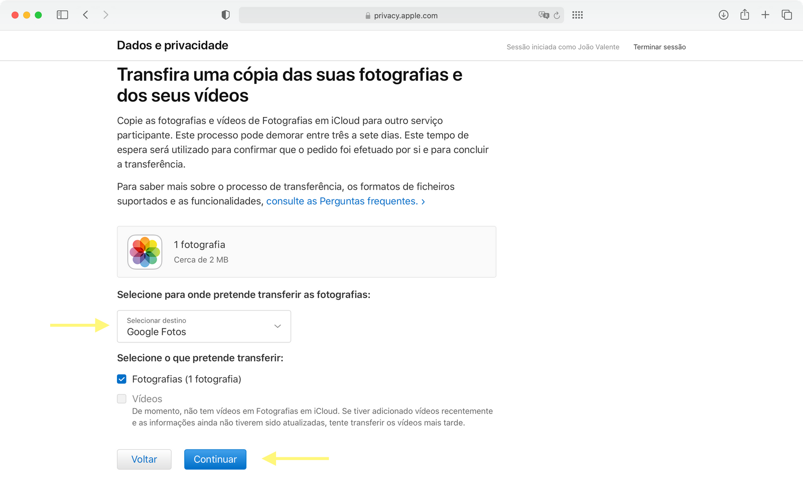 - Quando abrir a janela seguinte, onde consegues obter a informação relativa à quantidade e tamanho de fotos e vídeos que possuis no teu iCloud, podes selecionar para onde queres transferir os teus dados, e o que queres transferir em particular. Para já, está disponível apenas o Google Photos, mas espera-se que mais venham a ficar disponíveis nos próximos tempos;