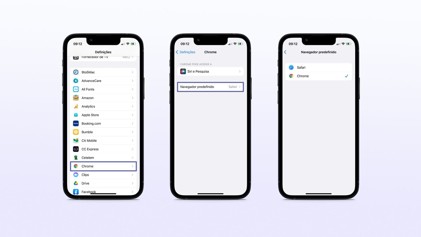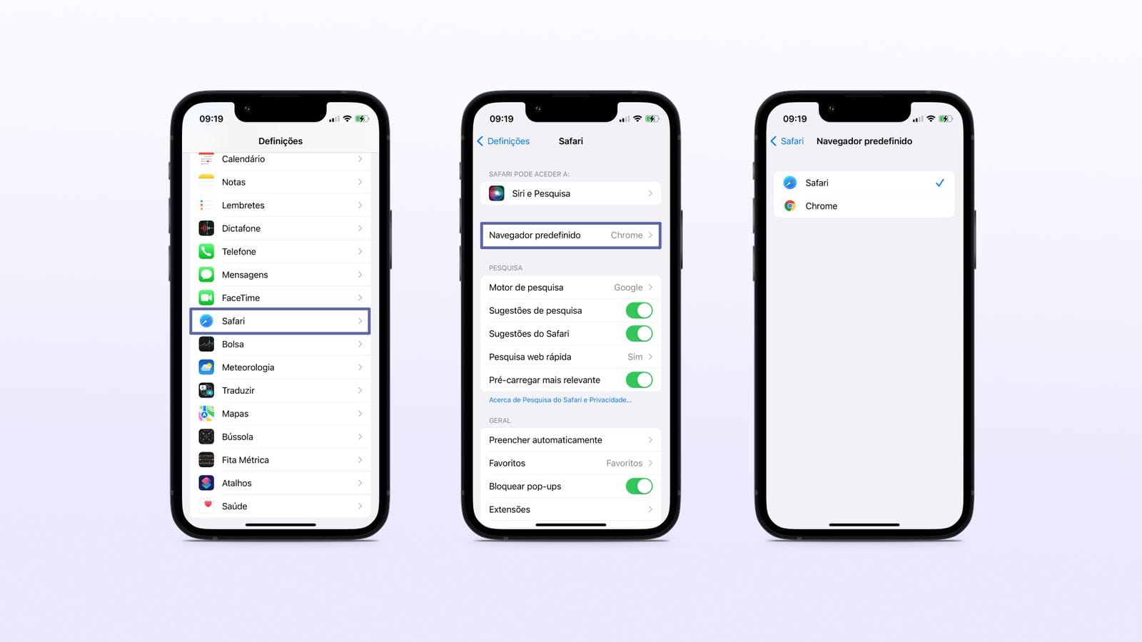 Caso te tenhas arrependido e desejes retornar com o Safari como browser predefinido, basta acederes às Definições > Safari > Navegador predefinido e selecionar o Safari.