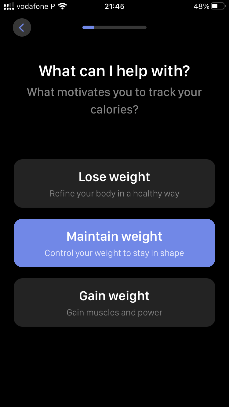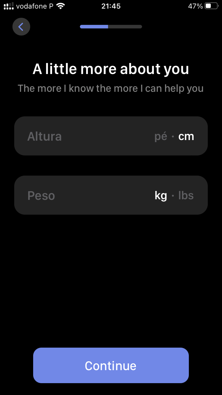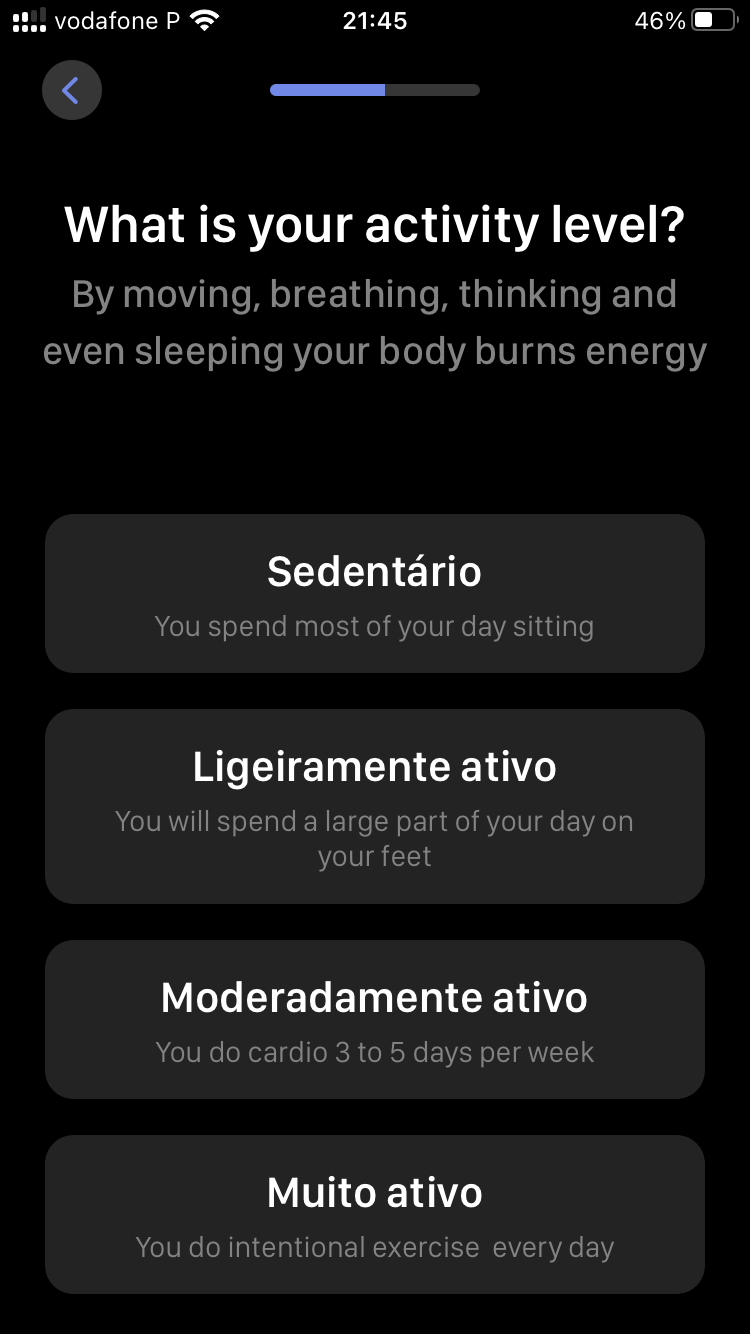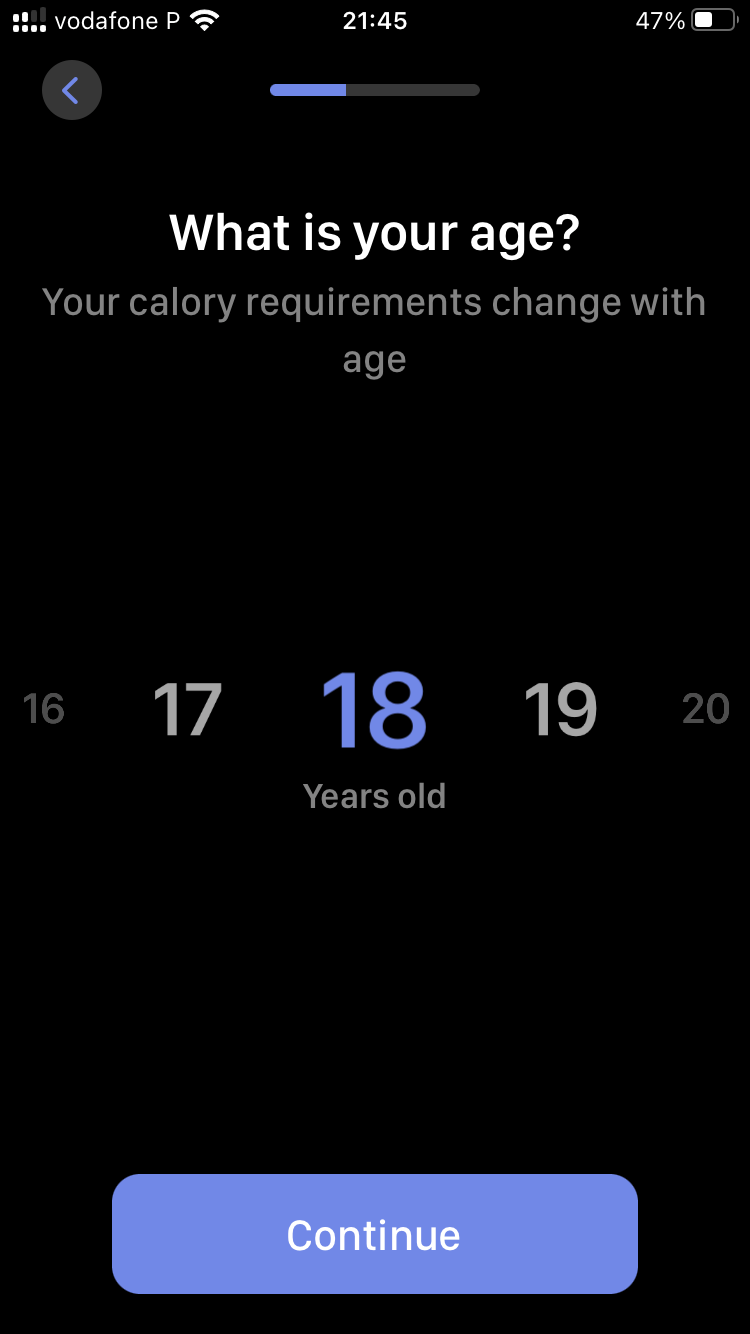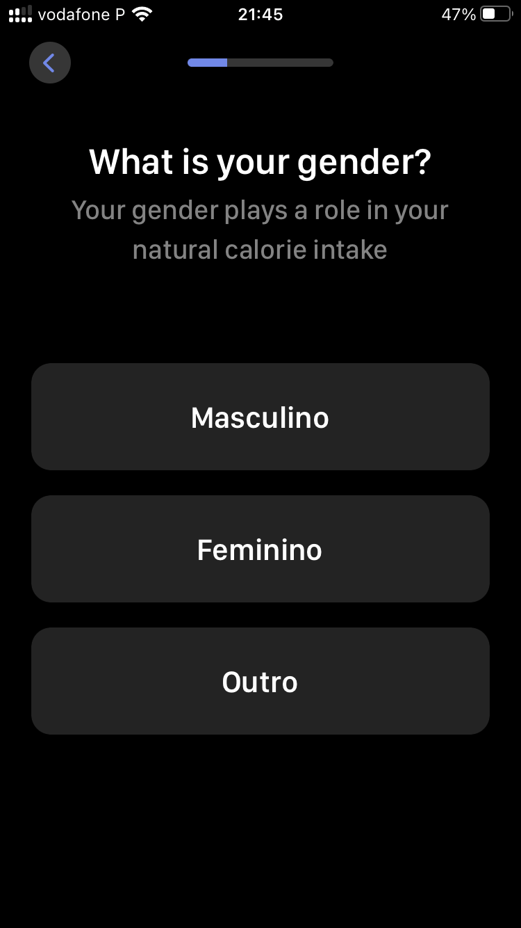 Quando abrimos a Calory pela primeira vez, somos abordados com uma série de questões sobre nós, o nosso estilo de vida, e o nosso objetivo. O intuito destas questões é fornecer à Calory o máximo de informação possível, que depois terá utilidade mais para a frente.