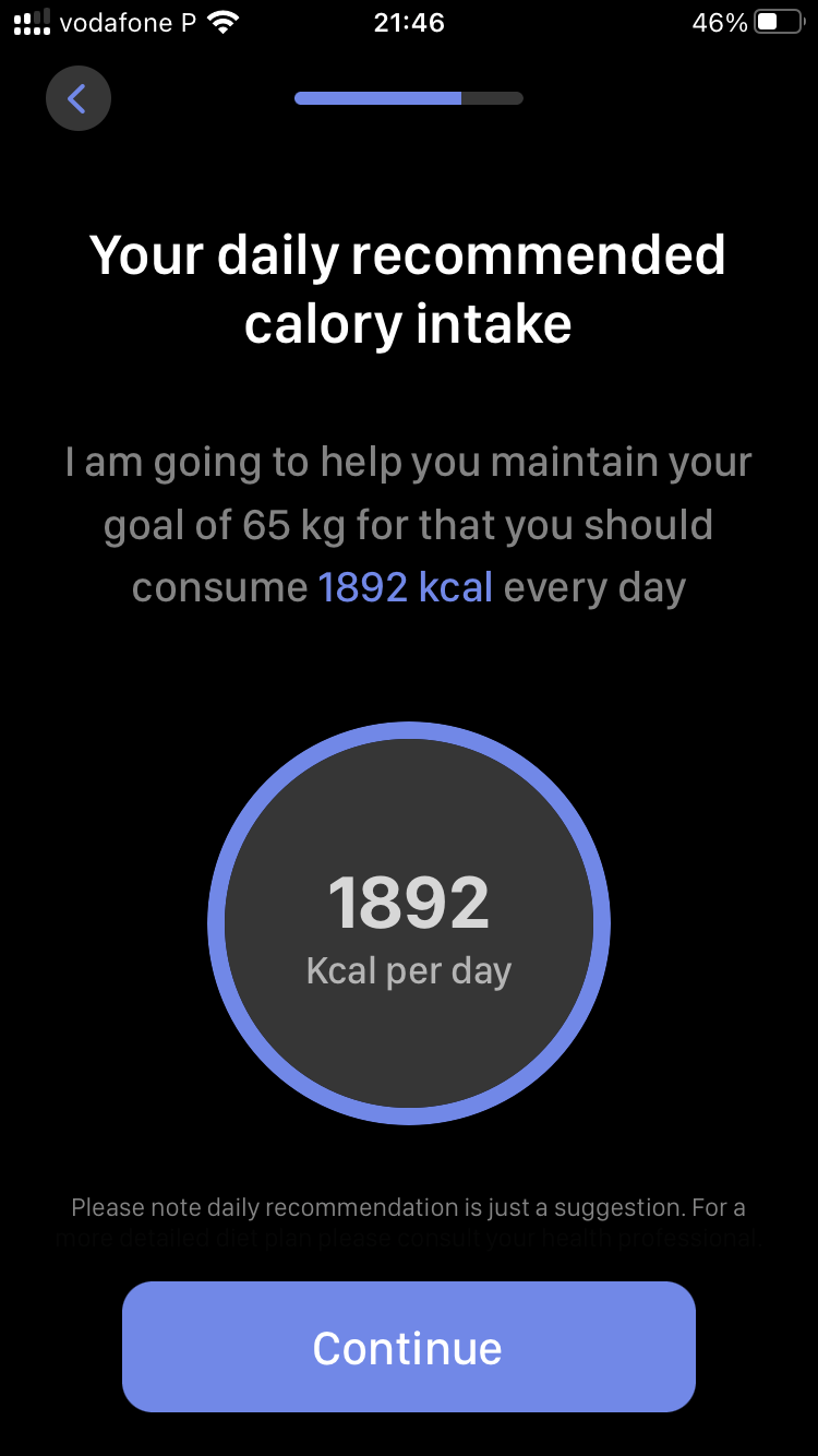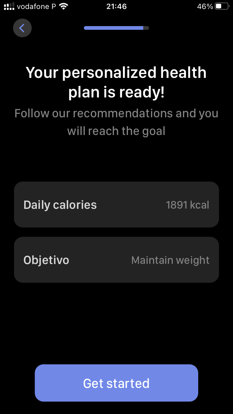 Após ter registo de toda a informação necessária, a Calory faz uma análise aos dados, e calcula a quantidade de calorias diárias que devemos ingerir de forma a atingirmos o objetivo a que nos propusemos no início.