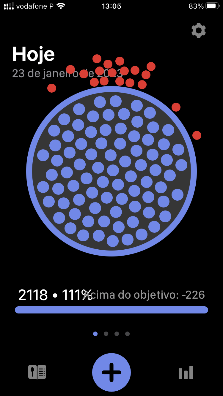 Como podem verificar, no dia 20 de janeiro apenas ingeri 68% das calorias que devia, e como tal o gráfico redondo, que vai enchendo ao longo do dia, não está totalmente preenchido. Já no dia 23 de janeiro, aconteceu precisamente o contrário: consumi bastante mais do que aquilo que devia, e prova disso são as bolas vermelhas que extrapolaram o bolo principal. Mas, afinal, como é que a Calory sabe isto? A resposta é simples: através dos dados que lhe vamos fornecendo, que não são nada mais, nada menos, do que a comida e bebida que ingerimos.