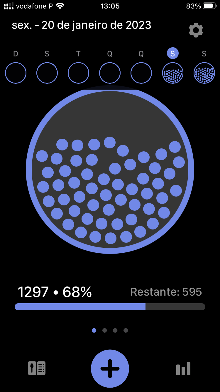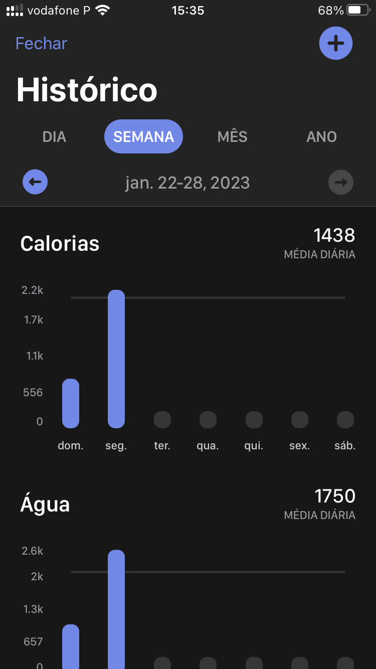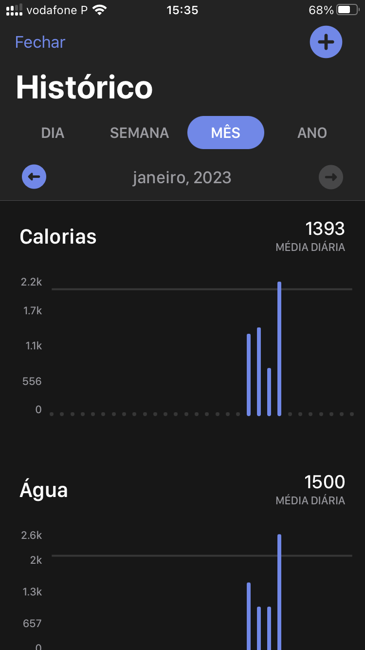 Tamanha quantidade de informação de nada serviria se não pudesse ser consultada e analisada posteriormente. Para esse efeito, existe o botão em forma de gráfico de barras, que se encontra no canto inferior direito do ecrã principal, e que dá acesso a uma zona com dados personalizados, divididos por dia, semana, mês e ano. A vista diária é a mais detalhada, pois nela conseguimos consultar todos os registos que inserimos ao longo desse periodo.