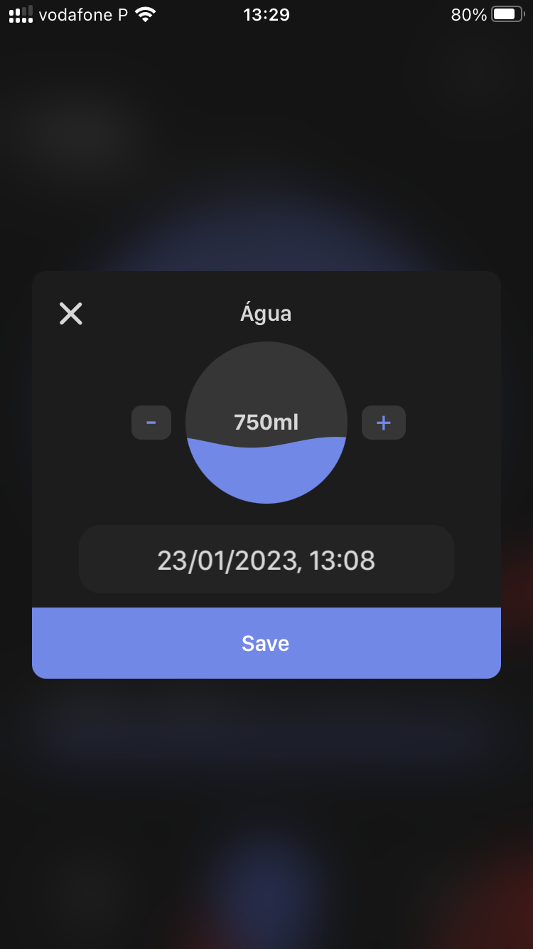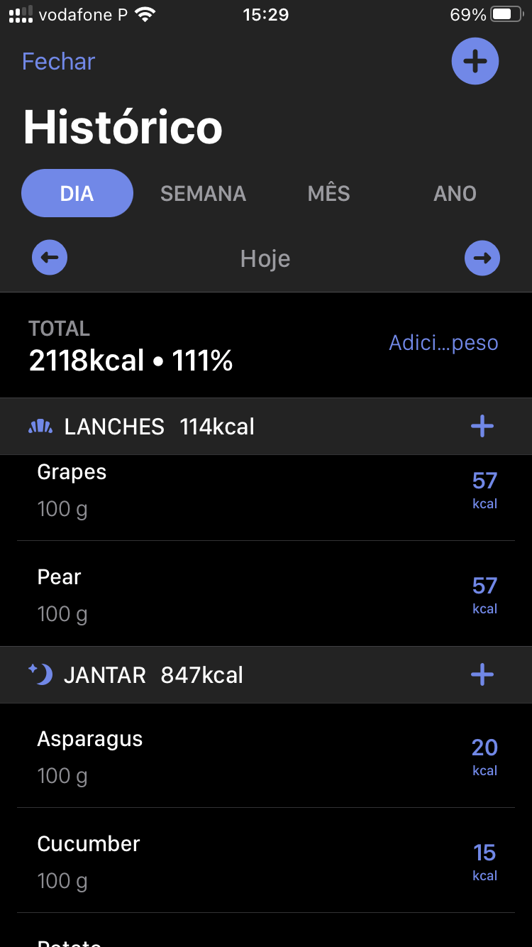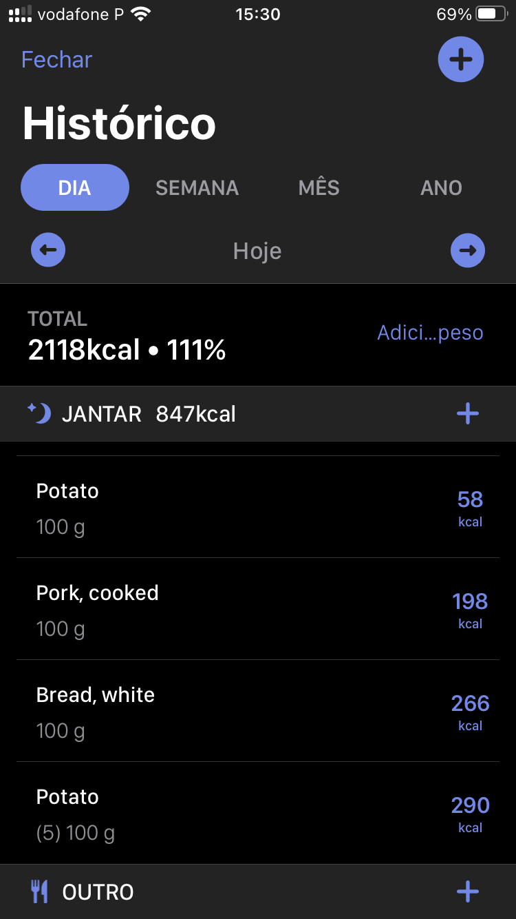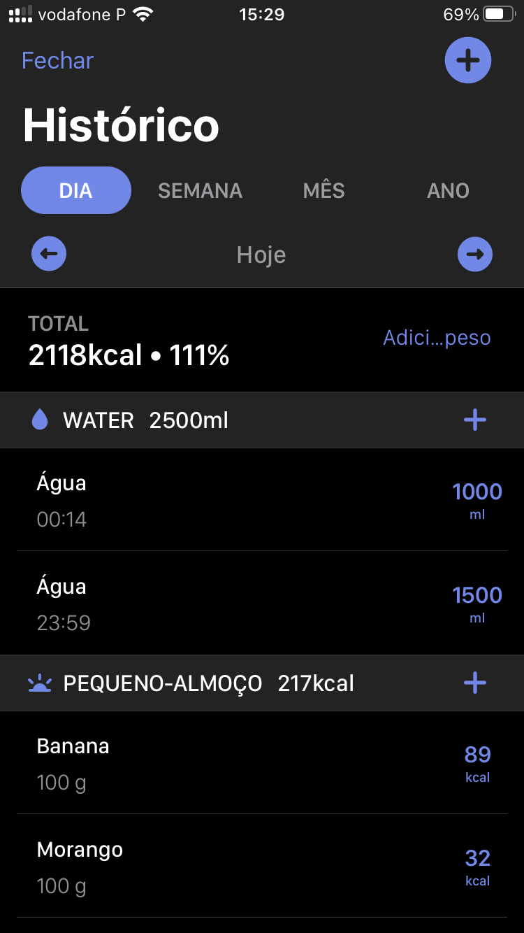 Como é possível verificar na primeira imagem, o sinal "'+" permite também, de forma rápida, adicionar manualmente calorias consumidas, atualizar o nosso peso, ou registar a ingestão de água.
