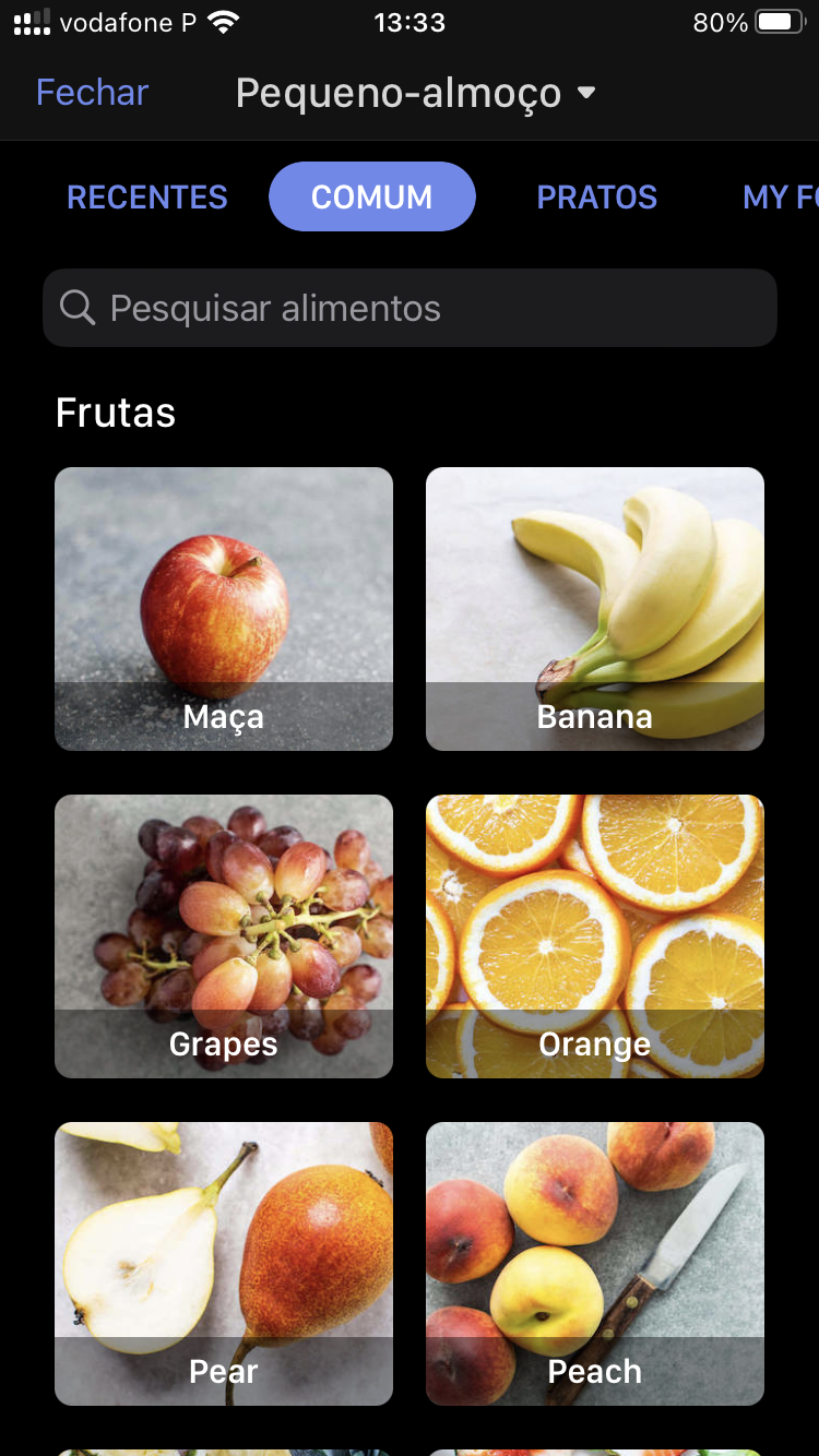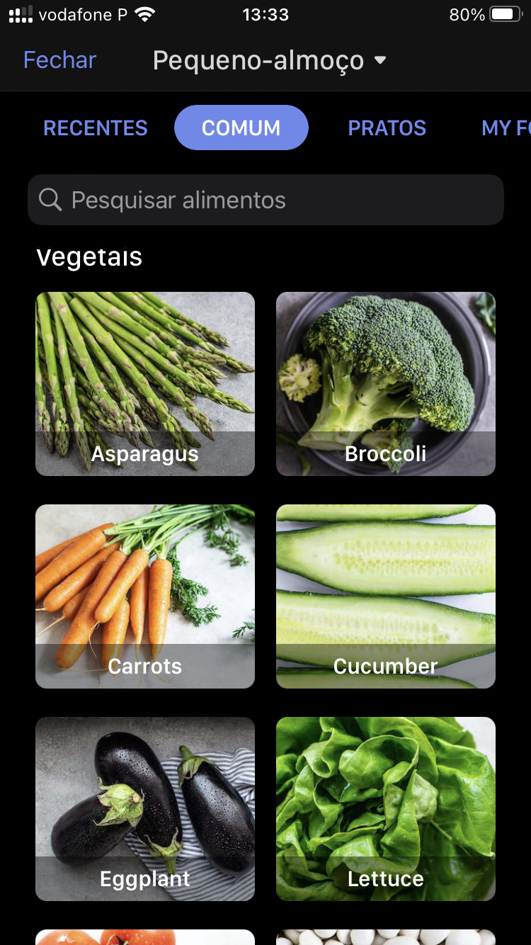 Existe um separador onde aparecem os nossos registos recentes, para o caso de ser necessário anotar alguma refeição repetida; o separador "comum" conta com alimentos divididos em categorias, e devidamente ilustrados com fotografias para uma melhor e mais célere identificação visual.