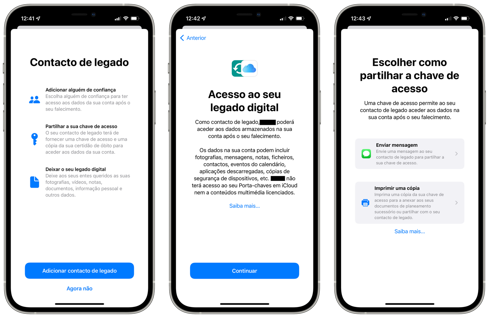 Permite designar pessoas como contactos de legado, para que possam aceder à sua conta em caso de falecimento.