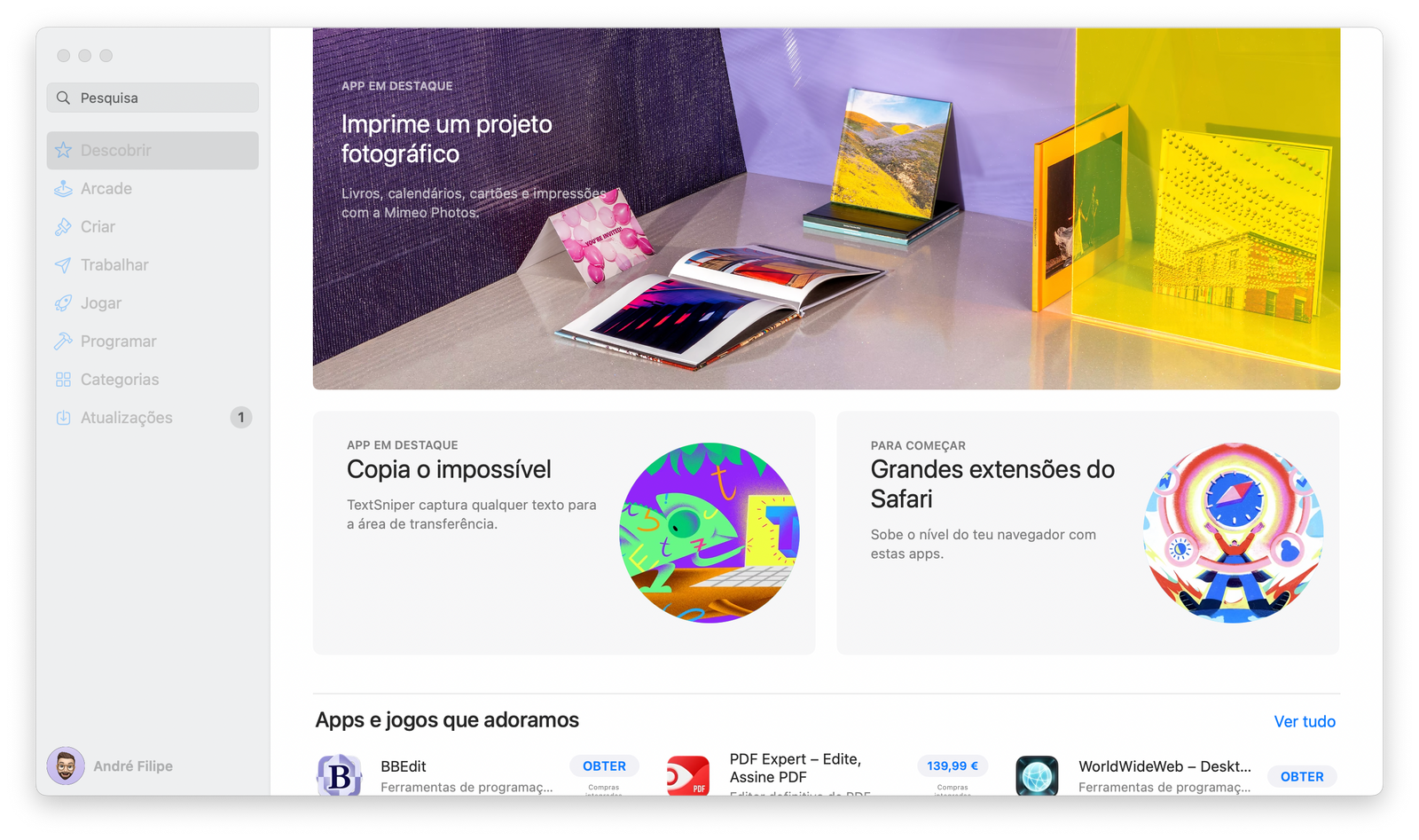 A primeira, e talvez a mais simples, é através da Mac App Store, disponível no teu Mac. Ao abri-la pela primeira vez, terás que iniciar sessão com o teu ID Apple para autorizar o computador a descarregar aplicações. Depois disto, é só procurares o que desejas e clicar no botão “obter".