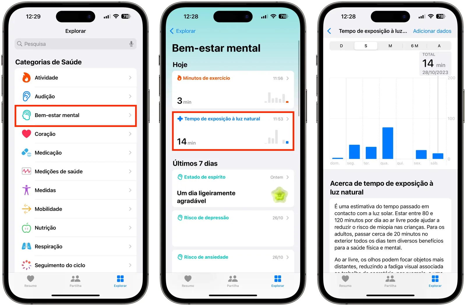 Acede à app Saúde e clica no canto inferior direito em "Explorar". Depois, vai até "Bem-estar mental" e clica em "Tempo de exposição à luz natural". Poderás então ver quanto tempo te expuseste ao grande astro que nos aquece no último ano, semestre, mês, semana ou dia.