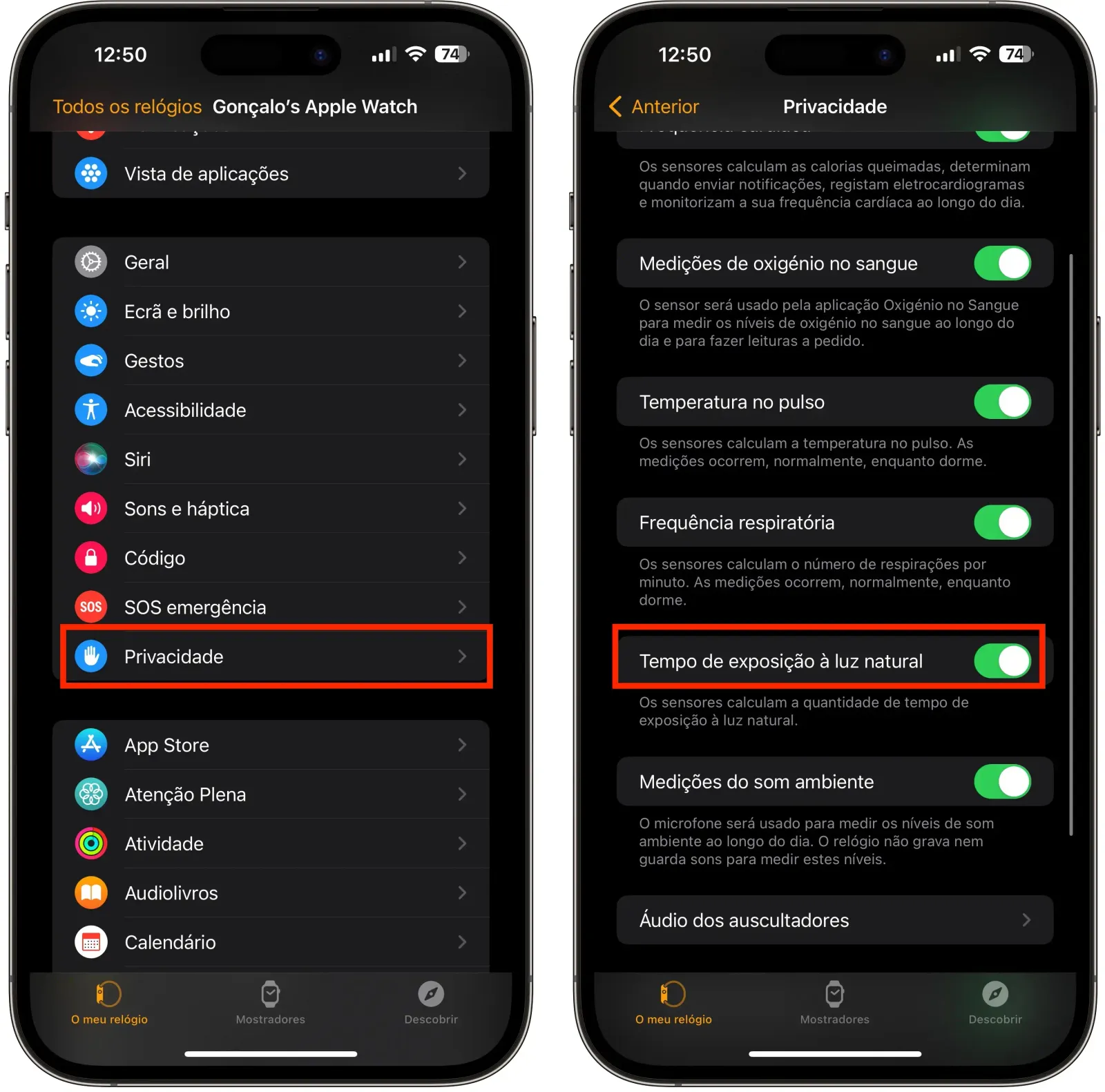 No iPhone, vai à app Apple Watch, clica em "Privacidade" e desloca-te até à secção "Tempo de exposição à luz natural".