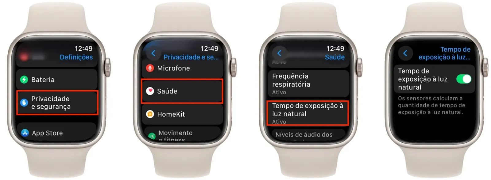 No Apple Watch, segue o seguinte trajeto: "Definições" -> "Saúde" -> "Tempo de exposião à luz natural"