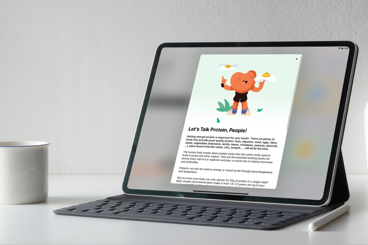 Dentro da própria aplicação, poderás encontrar artigos sobre o porquê de a proteína ser importante, sim, mas também sobre o facto de não poderes esquecer algumas gorduras. O mesmo sobre alimentos que podem ser mais relevantes para o teu bem-estar físico ou para o objetivo do teu treino.