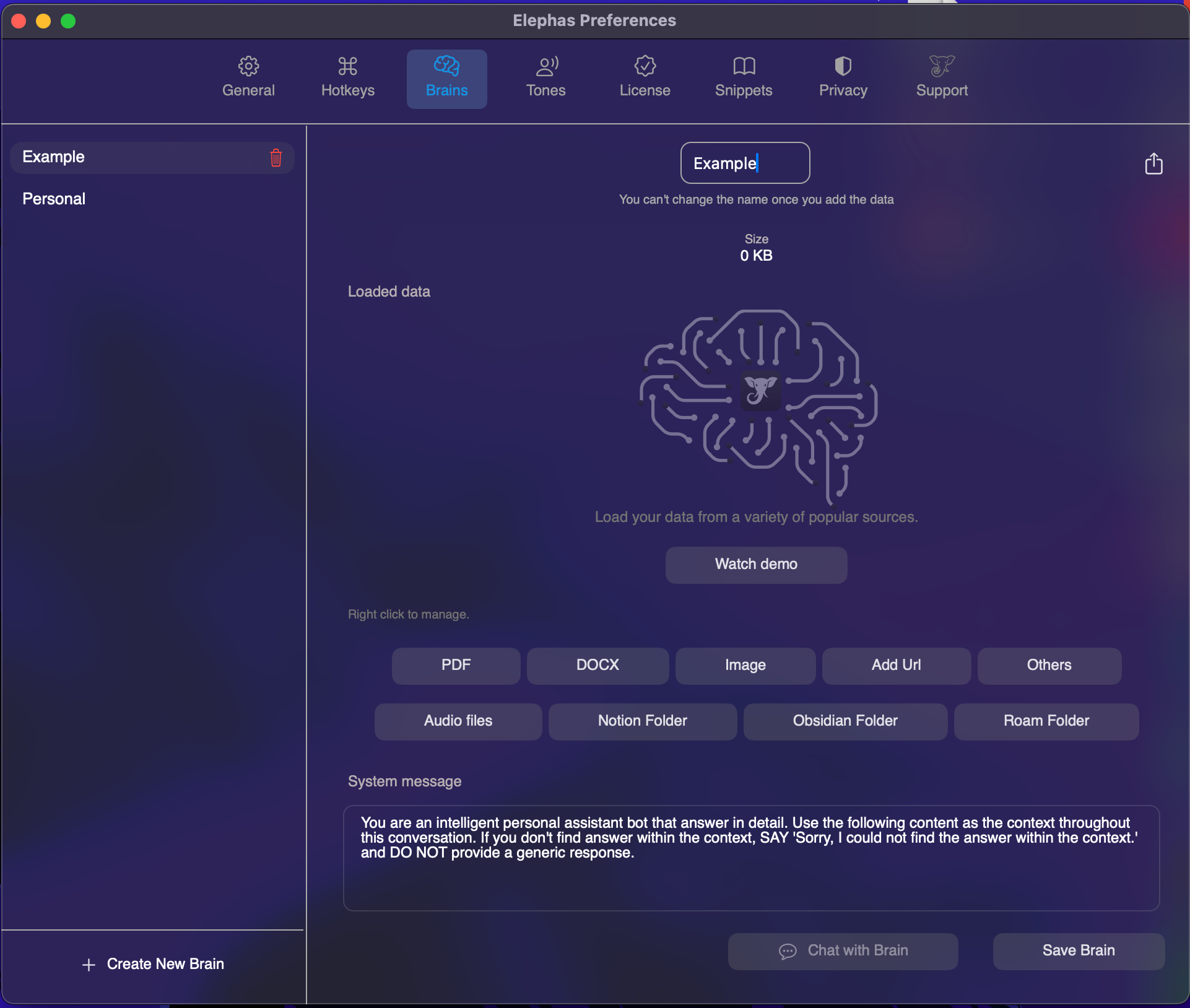 Uma funcionalidade que merece destaque é a Super Brain embutida na aplicação Elephas. Basicamente, este recurso permite que os seus utilizadores tragam o seu próprio conhecimento junto com os seus próprios dados de diversas fontes e construam uma base de dados, em torno de um único tópico.