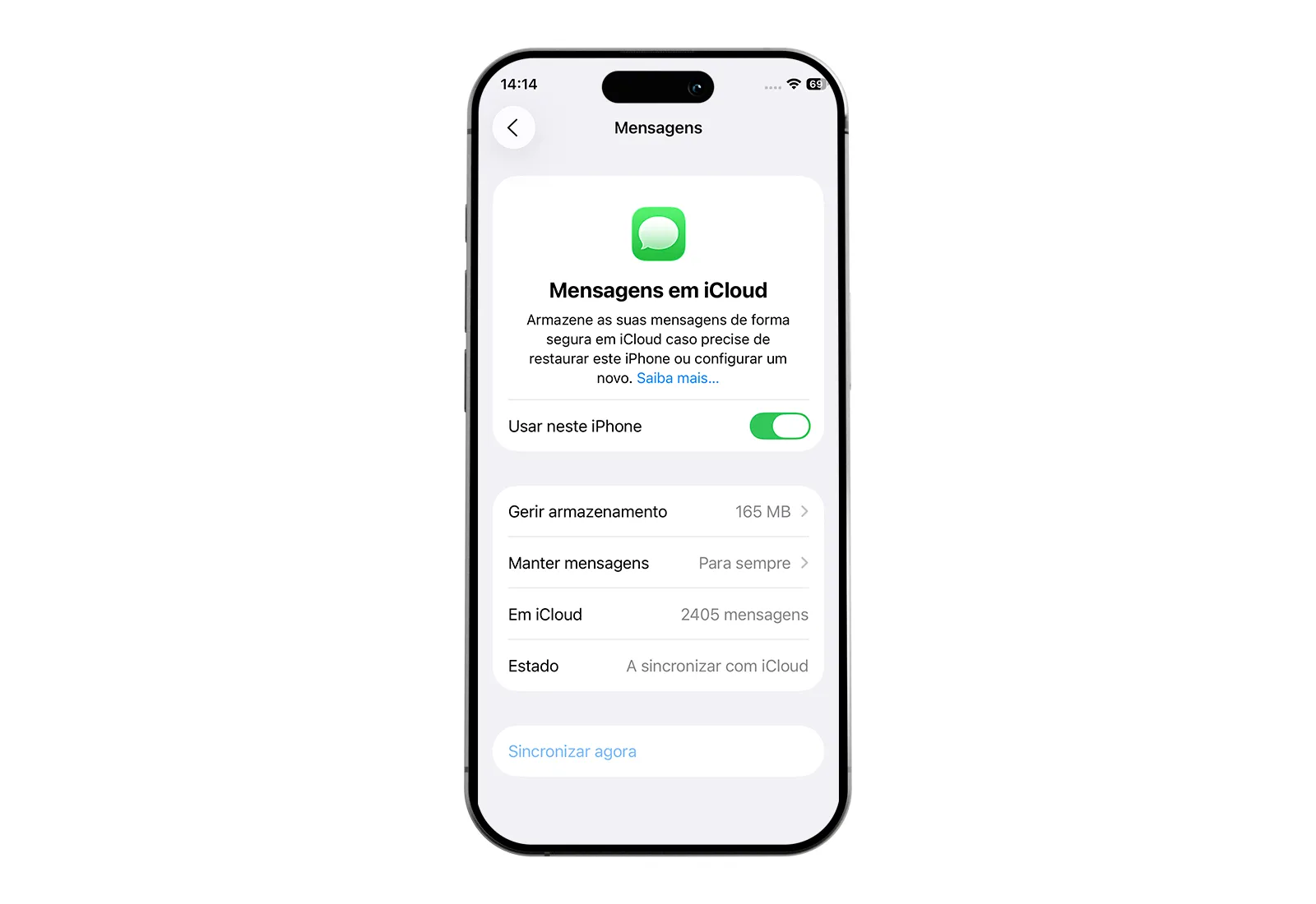 - Seleciona Mensagens em iCloud e desativa a opção