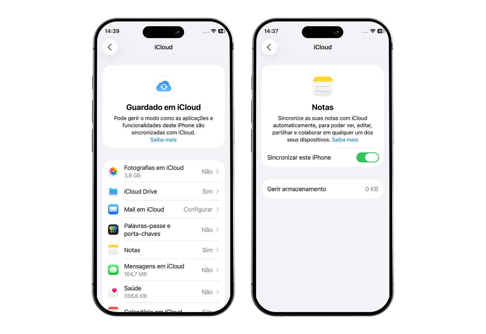 Apesar de parecer leve, a aplicação Notas pode guardar digitalizações, fotografias, checklists e outros conteúdos multimédia. Com o tempo, essas informações acumulam-se no iCloud, mas é possível desativar a sincronização: