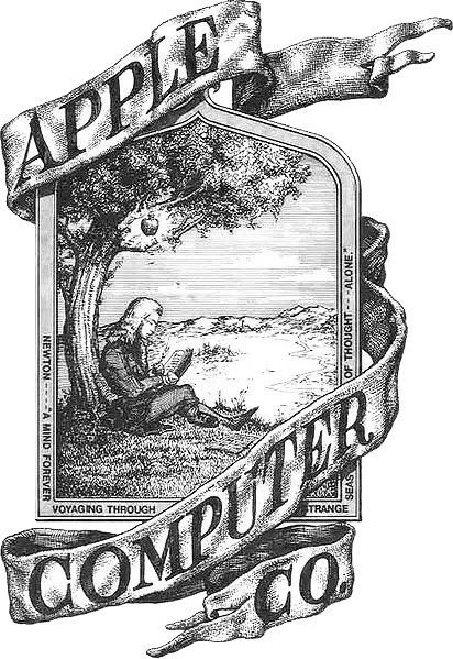 O primeiro logótipo da Apple, criado em 1976 por Ronald Wayne, é hoje pouco conhecido do público, mas ilustra bem os caminhos que a empresa poderia ter seguido. O emblema apresentava Isaac Newton sentado sob uma macieira, prestes a ser atingido por uma maçã. A imagem é delimitada por uma moldura, na qual se pode ler o excerto de um poema de William Wordsworth. "Newton... uma mente viajante por entre os estranhos mares do pensamento, sozinho".