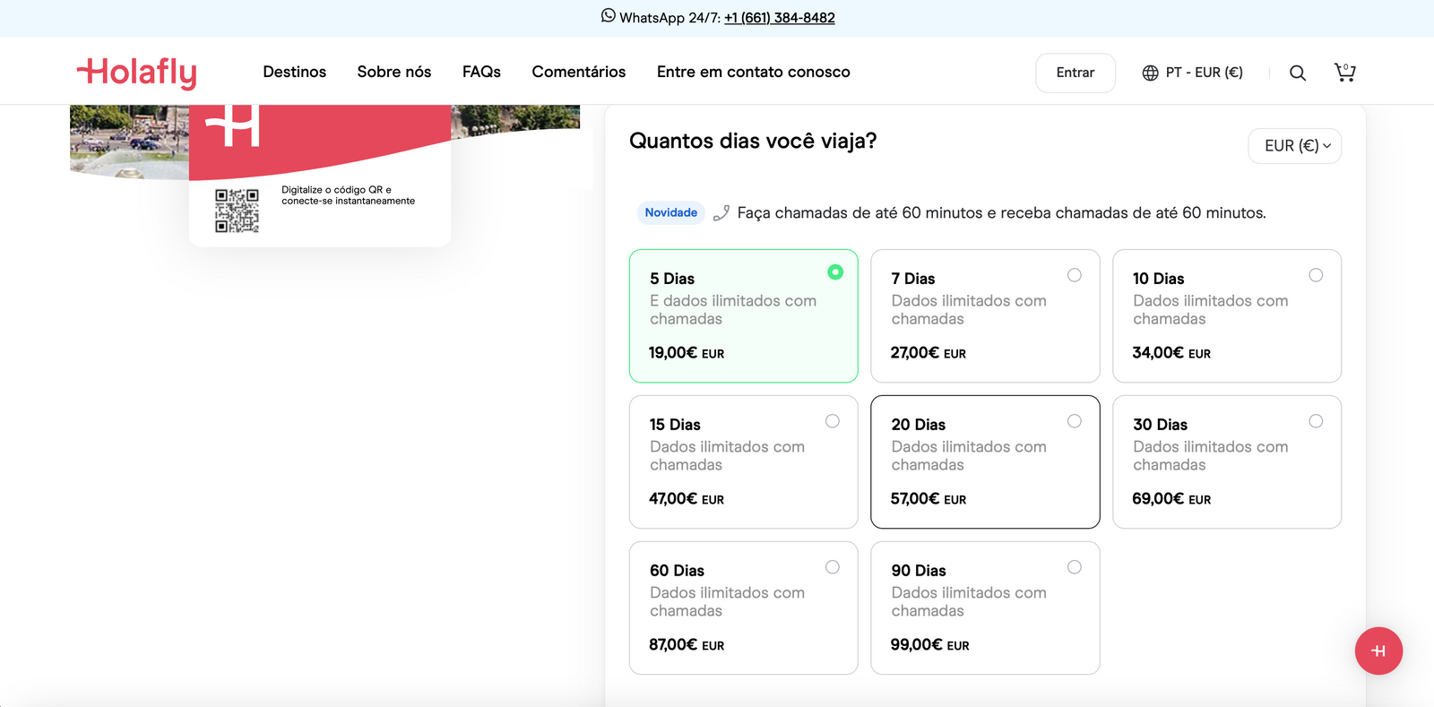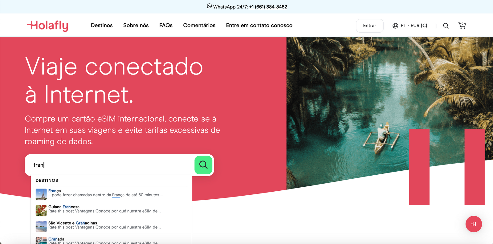 Esta é a minha interpretação da designação desta empresa: ¡Hola! Fly. Aderir e começar a utilizar é tão rápido como isso. Basta acederes ao website https://esim.holafly.com/pt/ e seguir os passos que se seguem: