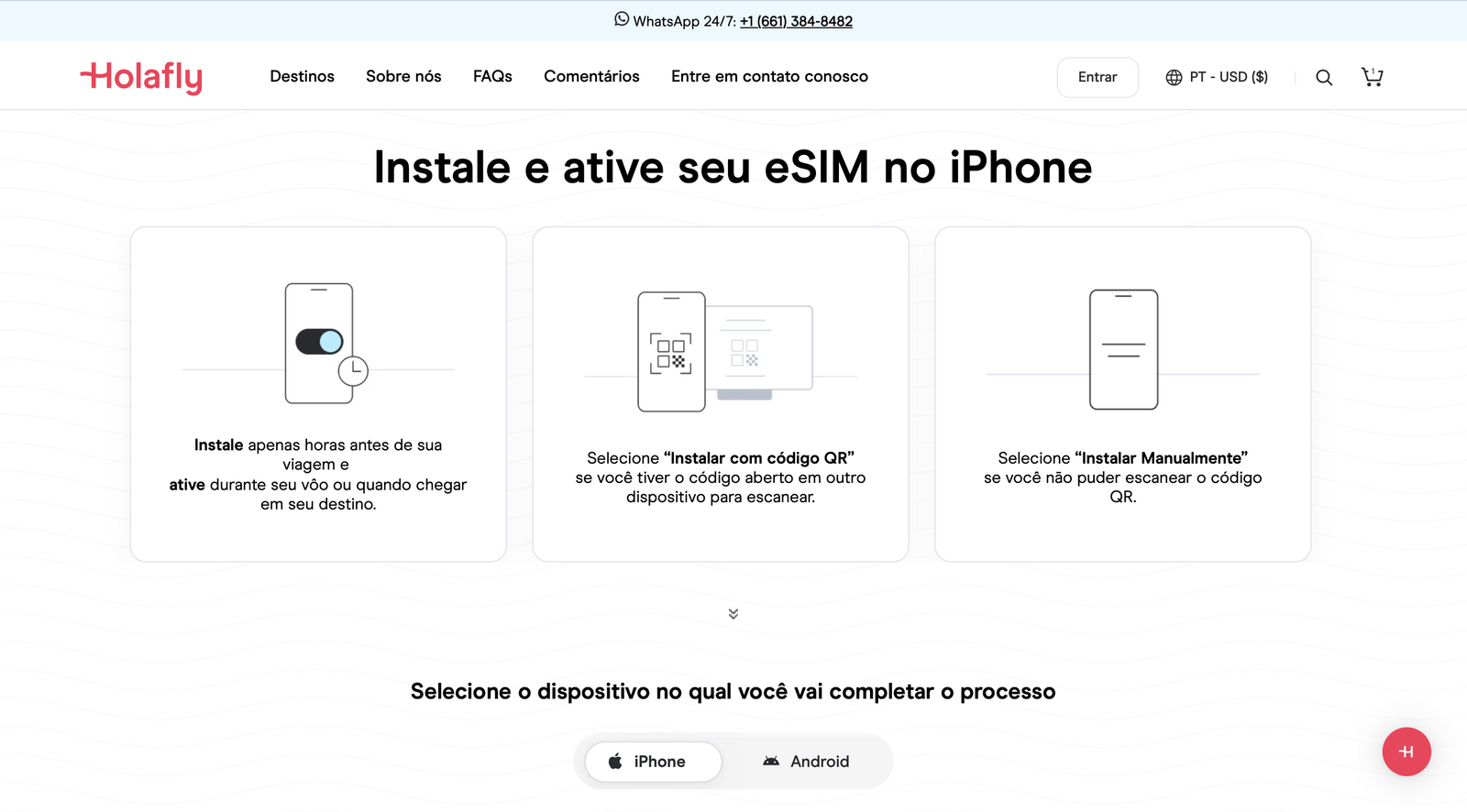 Instalar um cartão eSIM no teu iPhone poderá gerar imensas dúvidas. A Apple explica-te como (aqui), mas a Holafly ainda te explica melhor, porque está a apresentar-te um exemplo baseado precisamente no que estás a fazer.