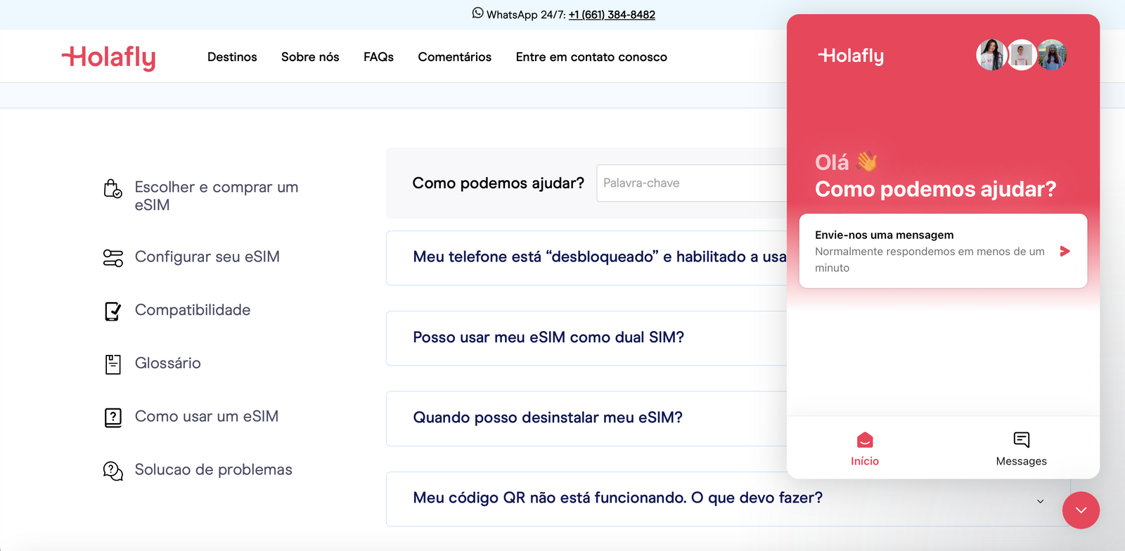 Ainda assim, se dúvidas persistirem, podes aceder às FAQ da Holafly, muito bem organizadas por temas (à esquerda do ecrã), contactar diretamente via WhatsApp (acima do ecrã), através do próprio website (canto inferior direito do ecrã), ou através do endereço de correio eletrónico para o efeito: help@holafly.com. Portanto, mais ajuda e transparência é impossível.