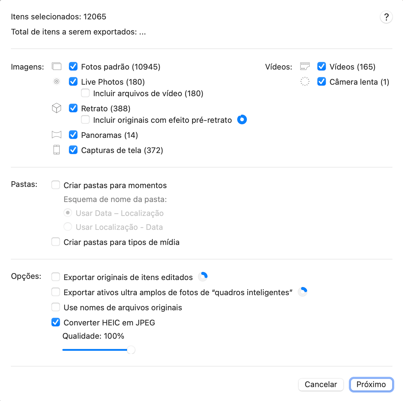 Uma brutalidade! Posso fazer tudo e mais alguma coisa. Selecionar o tipo de imagem que quero exportar, criar pastas para os momentos criados pelo iPhone e mesmo criar pastas que separam os tipos de media audiovisual!