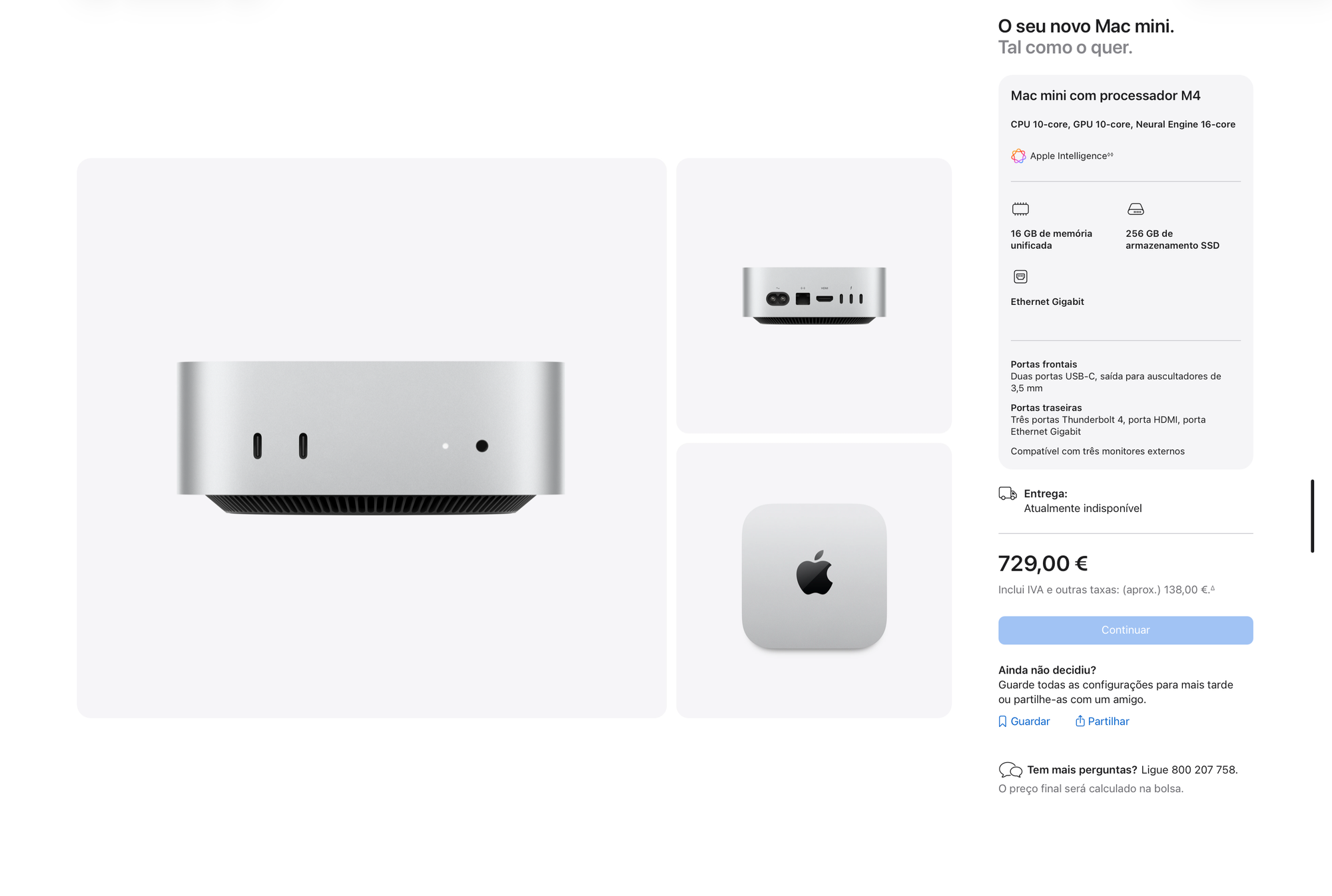Ainda assim, há uma “escapatória”: retalhistas como Worten, Radio Popular ou a Darty continuam a ter stock do modelo base, com entregas rápidas entre 1 a 2 dias úteis. Ou seja, se estavas mesmo decidido em comprar o Mac mini (modelo base), talvez não seja má ideia olhar para fora da loja oficial.