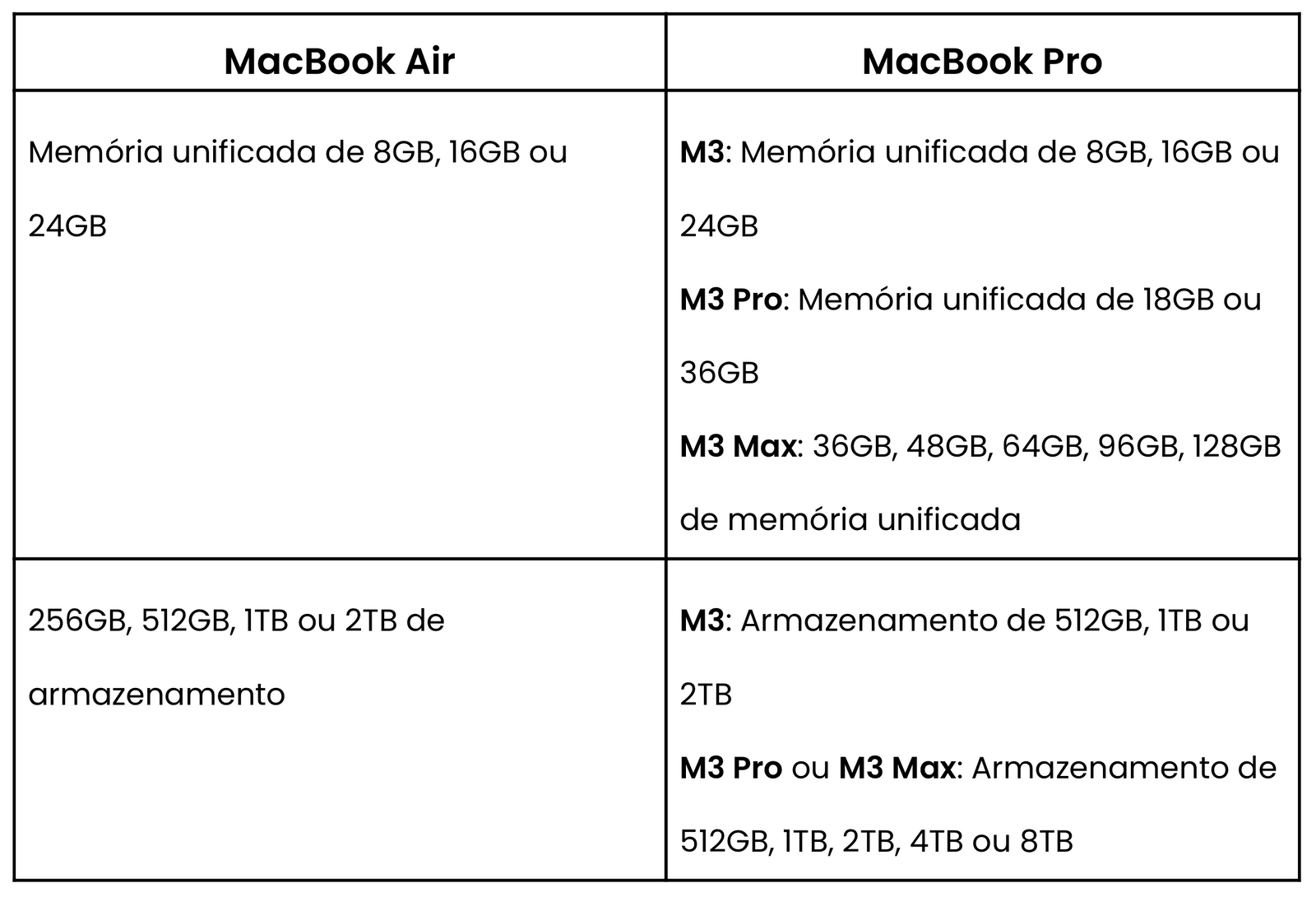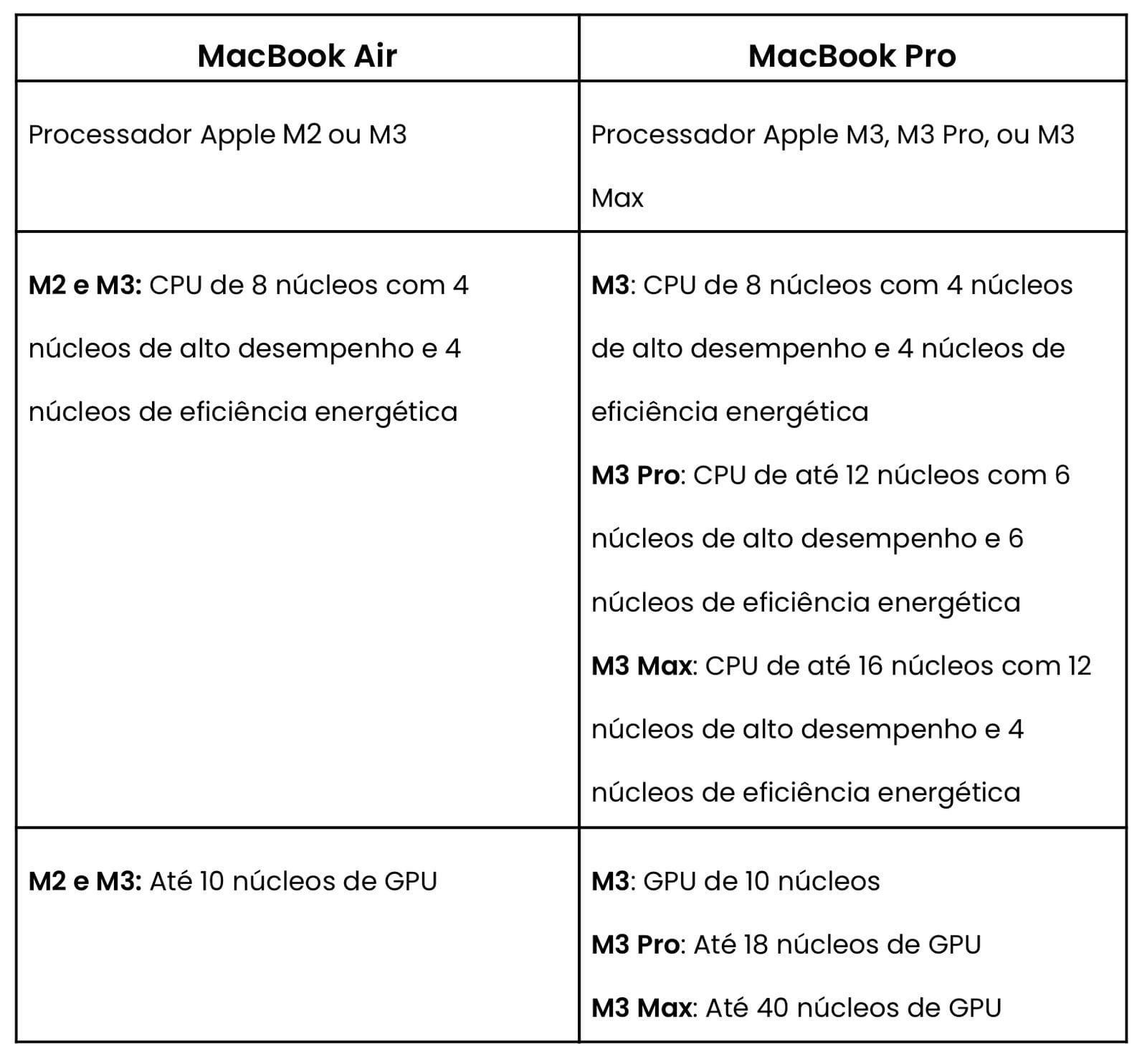 Os MacBook Pro têm opções de chips mais poderosos do que o MacBook Air, com as versões M3 Pro e M3 Max, que oferecem melhor desempenho em tarefas que exigem bastante do CPU e GPU.