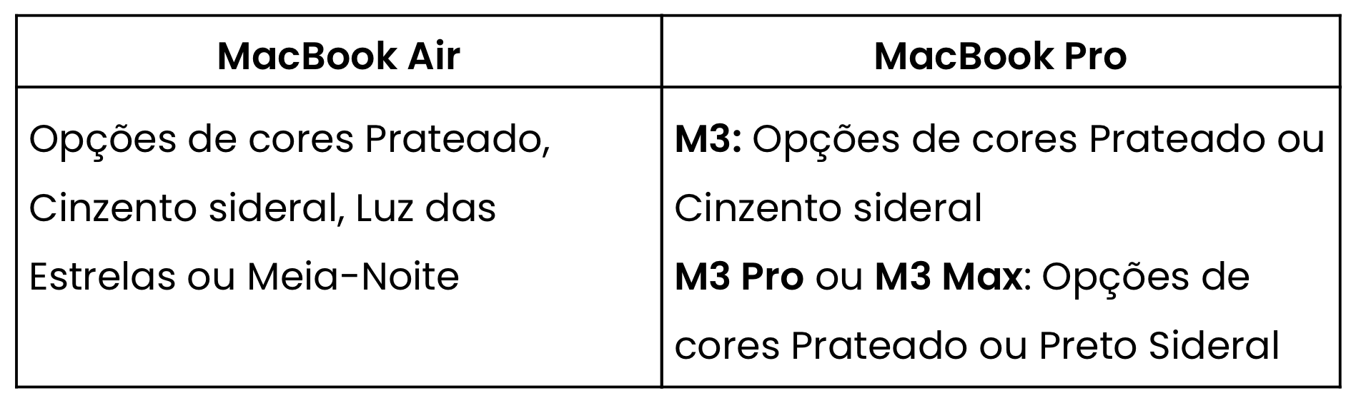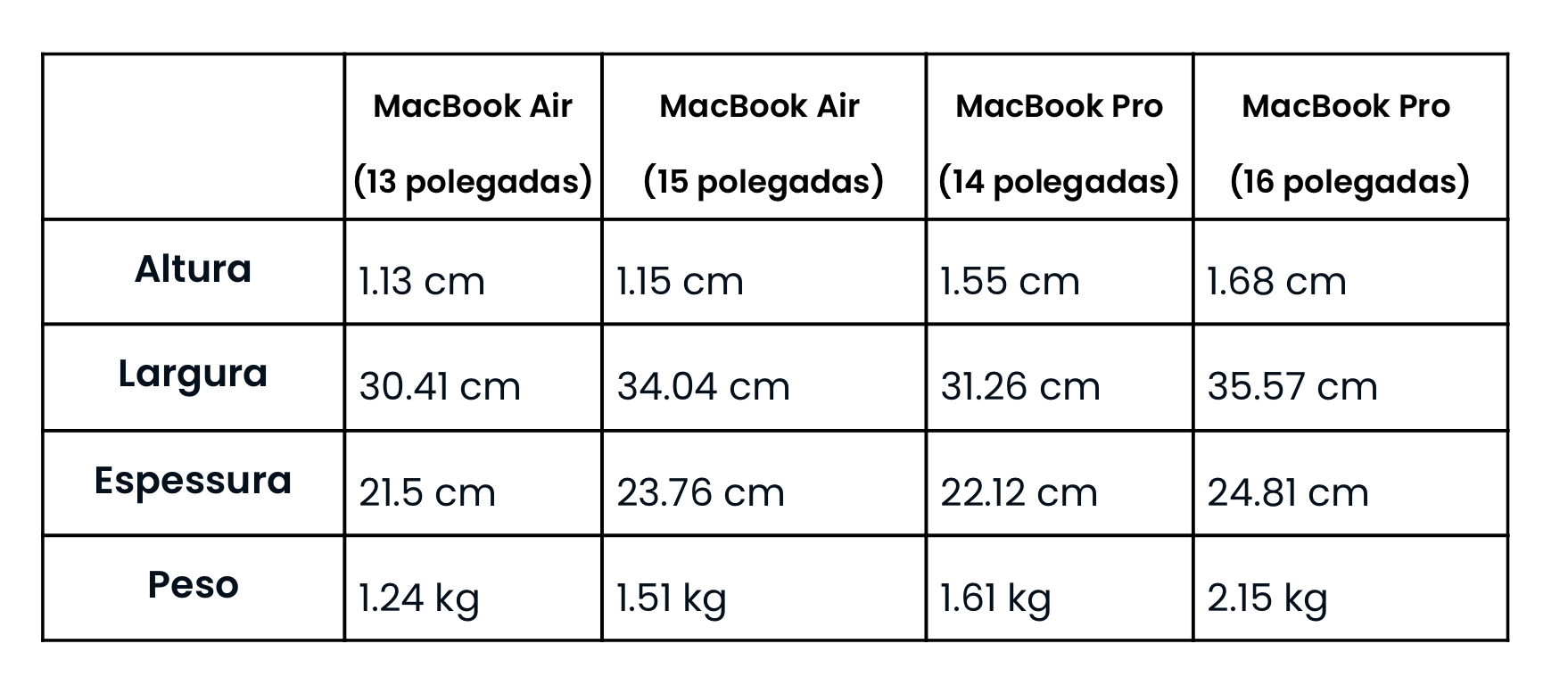 Por outro lado, o MacBook Air está disponível em mais opções de cores do que o MacBook Pro e oferece maior portabilidade, dado que os modelos deste último, embora altamente portáteis, são, no geral, mais espessos, largos e mais pesados.