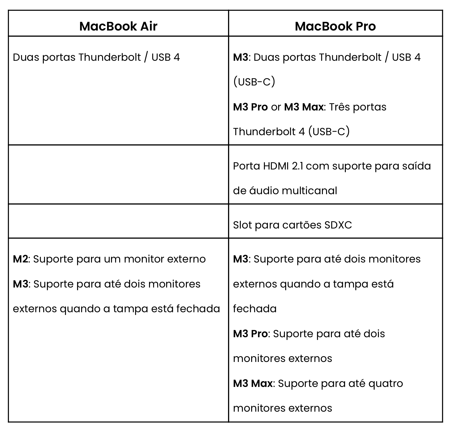 O MacBook Air apresenta apenas duas entradas Thunderbolt, enquanto que MacBook Pro oferece mais opções, incluindo uma porta HDMI 2.1 e uma slot para cartão SDXC, o que o torna mais versátil em termos de conectividade física.