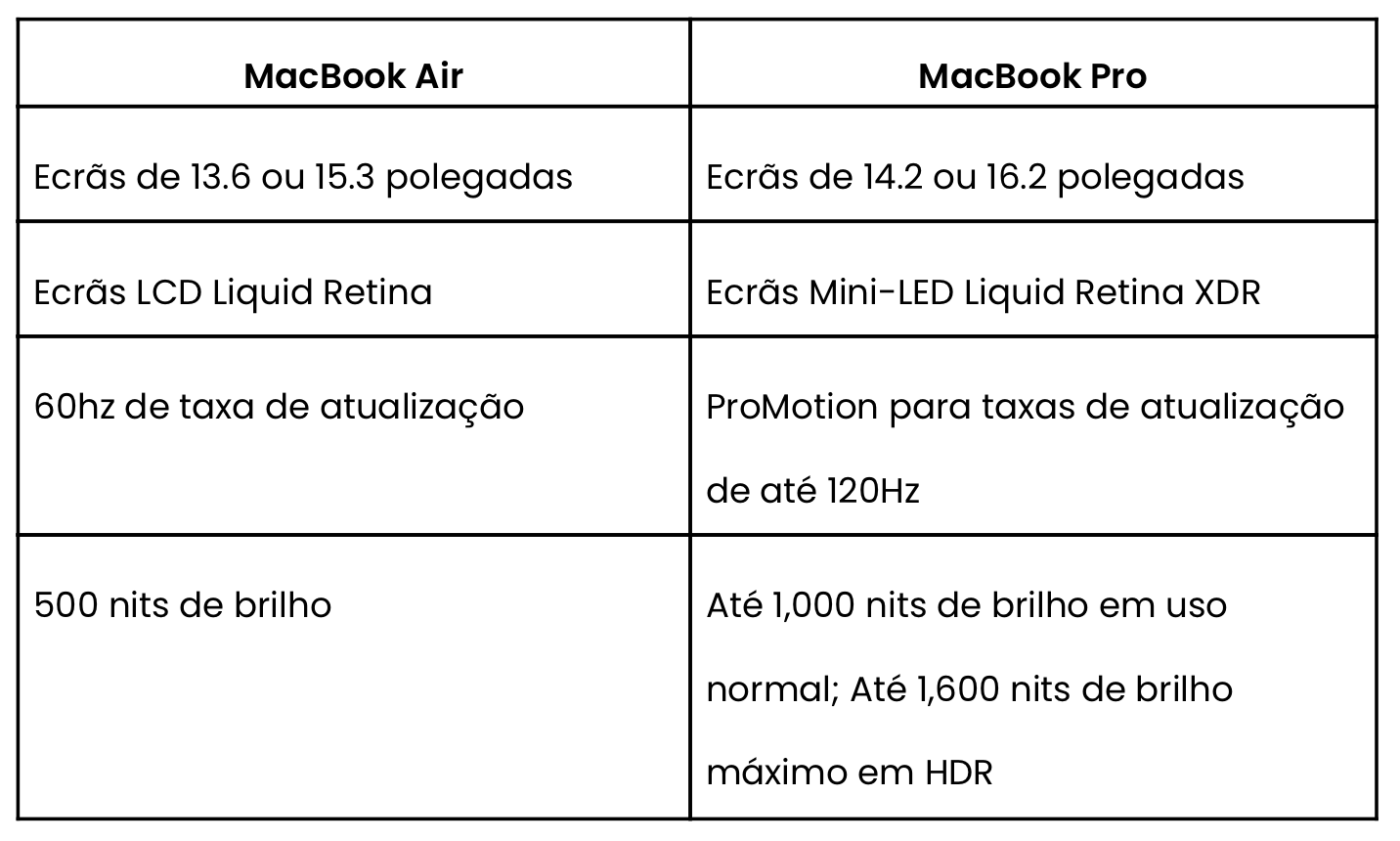 O MacBook Pro apresenta também uma tecnologia de ecrã mais avançada (mini-LED Liquid Retina XDR, em comparação com os ecrãs LCD do MacBook Air), o que proporciona pretos mais profundos e uma experiência visual mais rica de um modo geral.