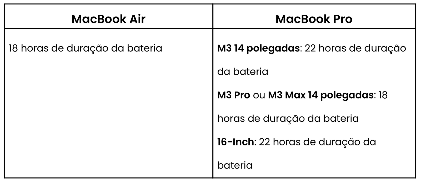 O MacBook Air tem uma autonomia de bateria de 18 horas, a mesma do MacBook Pro de 14 polegadas com os chips M3 Pro ou M3 Max. Já os MacBooks Pro M3 de 14 polegadas e 16 polegadas permitem até 22 horas de utilização.