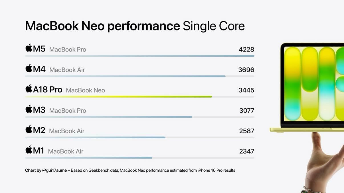 Na prática, isto significa que o MacBook Neo deverá sentir‑se extremamente rápido em navegação web, edição leve de imagem, escrita, programação básica ou consumo de conteúdos. Para muitos utilizadores, este tipo de desempenho é mais perceptível do que ganhos em multi‑core.