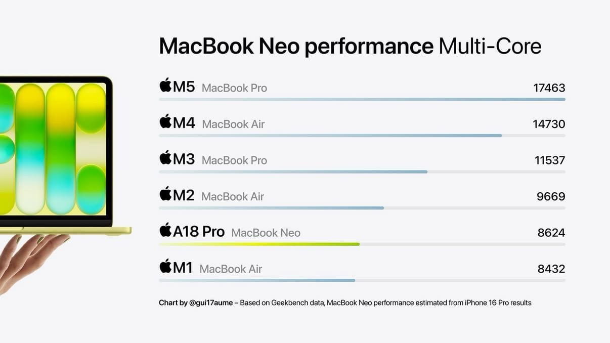 Face a um MacBook Air M2 ou M3, o Neo oferece uma experiência mais rápida em tarefas simples, mas perder em cargas prolongadas. Em relação ao MacBook Air com o M1, o salto em single‑core é claro, tornando o Neo uma alternativa moderna e mais responsiva. Já perante os MacBook Pro, a comparação deixa de fazer sentido - são máquinas pensadas para públicos e exigências completamente diferentes.