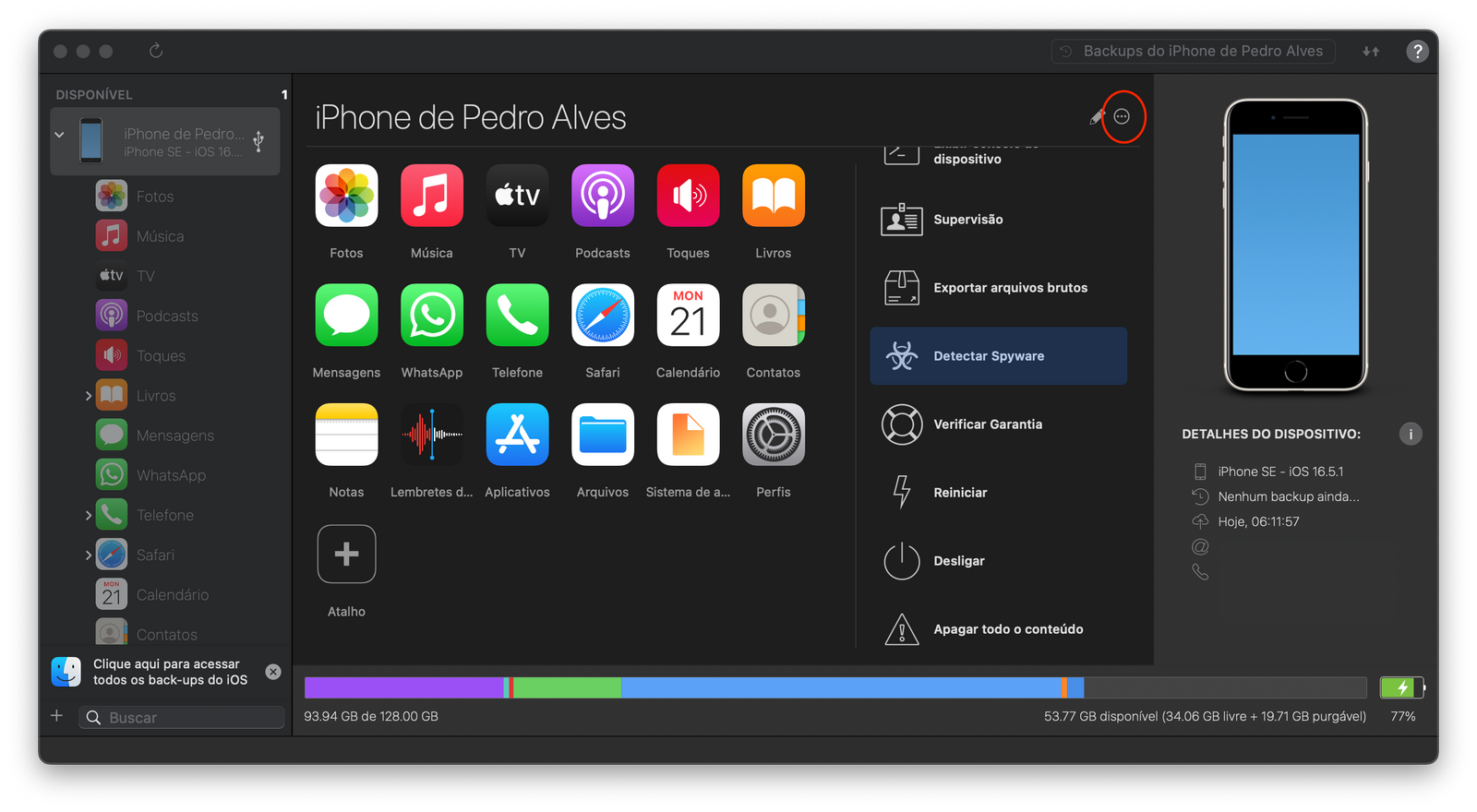 Na hora de fazeres um backup ao teu iPhone, seja por que motivo for, é importante que saibas que tens várias personalizações à tua disposição. As mesmas são acessíveis a partir do botão de opções, que são os três pontinhos que aparecem no canto superior direito, no final da linha que contém o nome do iPhone.