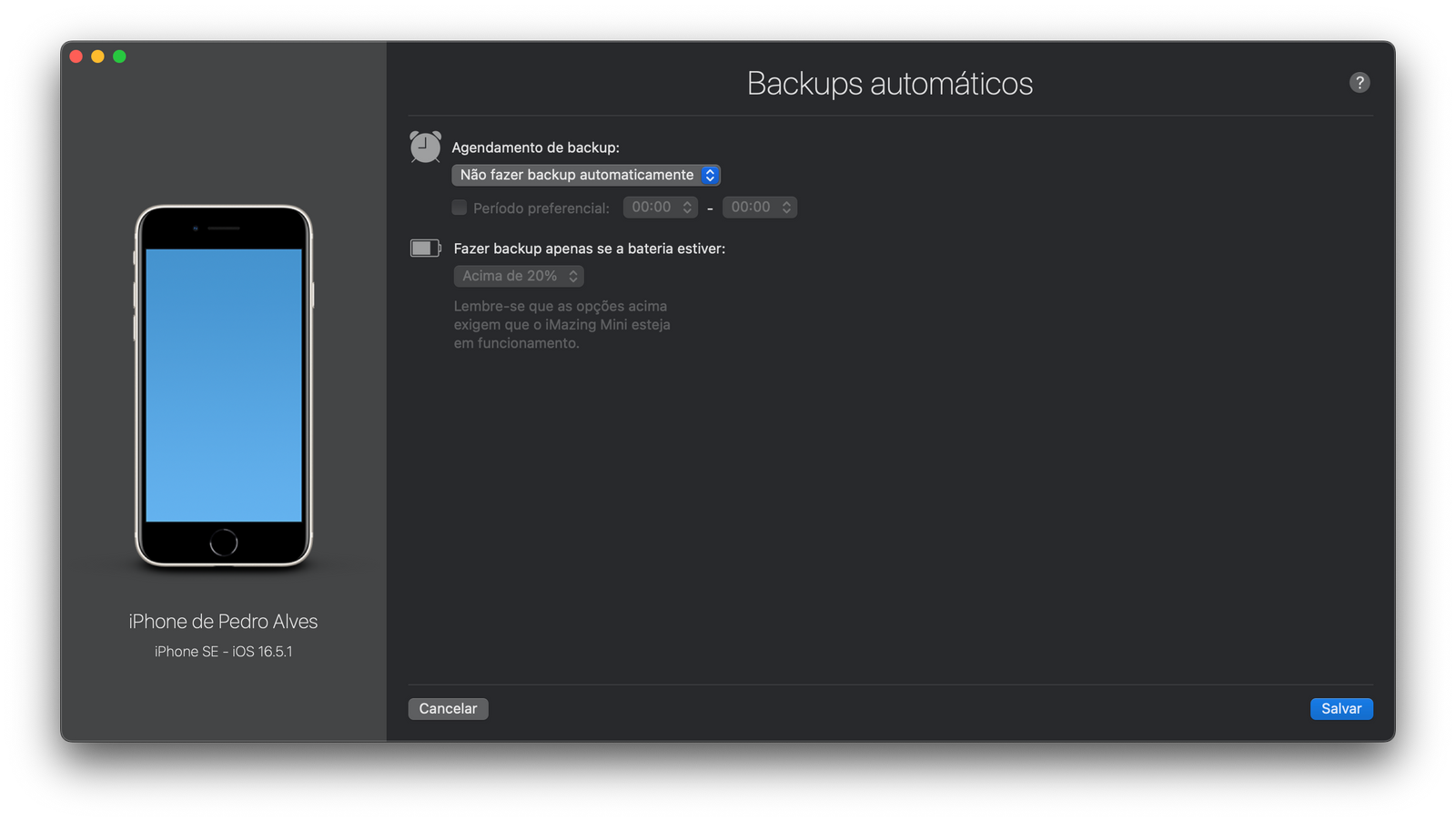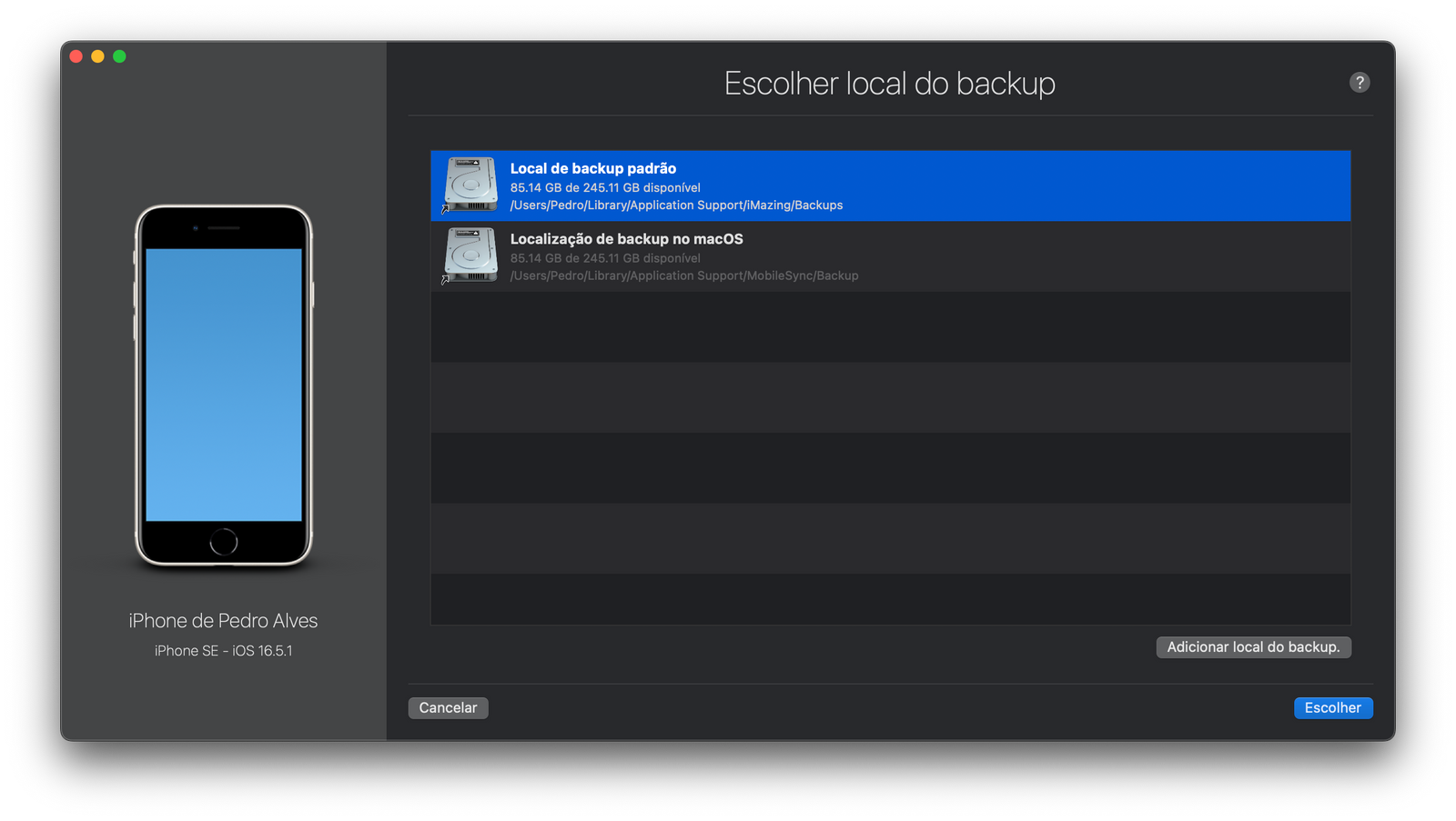 É possível definires o local no qual o iMazing possa guardar as cópias de segurança dos teus dispositivos Apple.