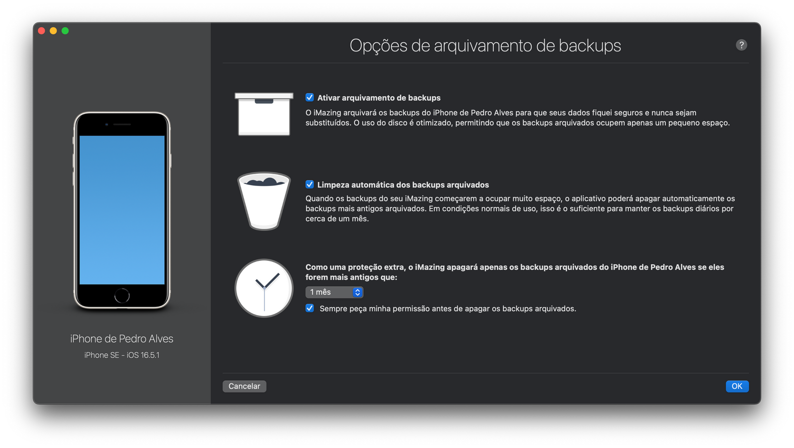 Nas opções de arquivo dos backups podes escolher aquilo que queres que o iMazing faça com as cópias de segurança mais antigas.