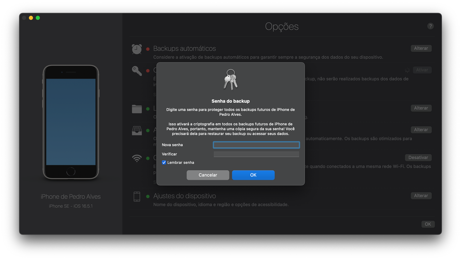 Logo que abrimos a respetiva opção temos de escolher uma palavra-passe, que será usada em todos os backups futuros do iPhone em questão. É muito importante manter esta palavra-passe cuidadosamente segura, de preferência num local (ainda que seja físico) ou dispositivo diferentes dos que estiverem a ser usados para este procedimento. Em alternativa, deixar marcada a opção "Lembrar senha" vai memorizar a mesma no porta-chaves do teu Mac, que pode ou não ser sincronizado com todos os teus equipamentos Apple através do iCloud.