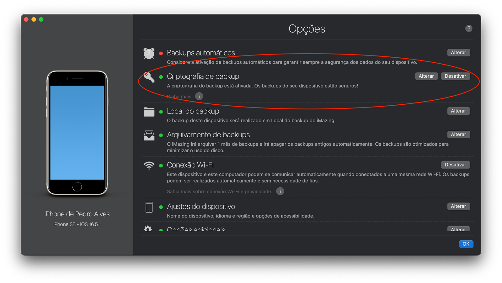 Apesar da encriptação não estar ativa por defeito, é altamente recomendado ligá-la. É importante ter conhecimento que o iMazing usa os parâmetros da Apple neste ponto específico, ficando assim assegurada a utilização de criptografia AES-256.