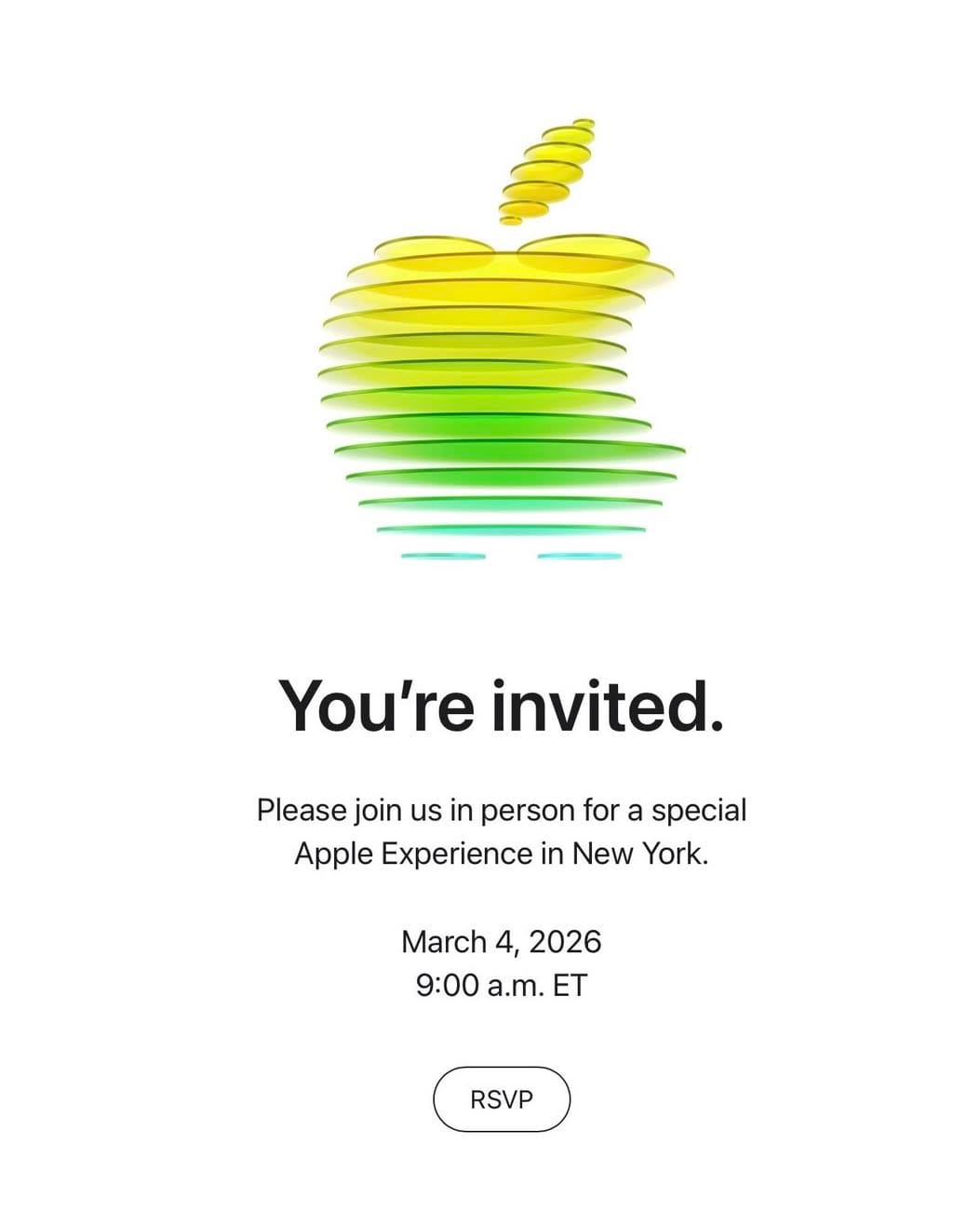 A Apple confirmou oficialmente a realização de um evento especial no próximo dia 4 de março, em Nova Iorque, com início marcado para as 9h00 (hora local). Isto é, às 14H00 de Portugal Continental. Com efeito, a empresa convidou membros da imprensa para aquilo que descreve como uma “Apple Experience”, afastando-se da designação habitual de keynote ou apresentação tradicional.