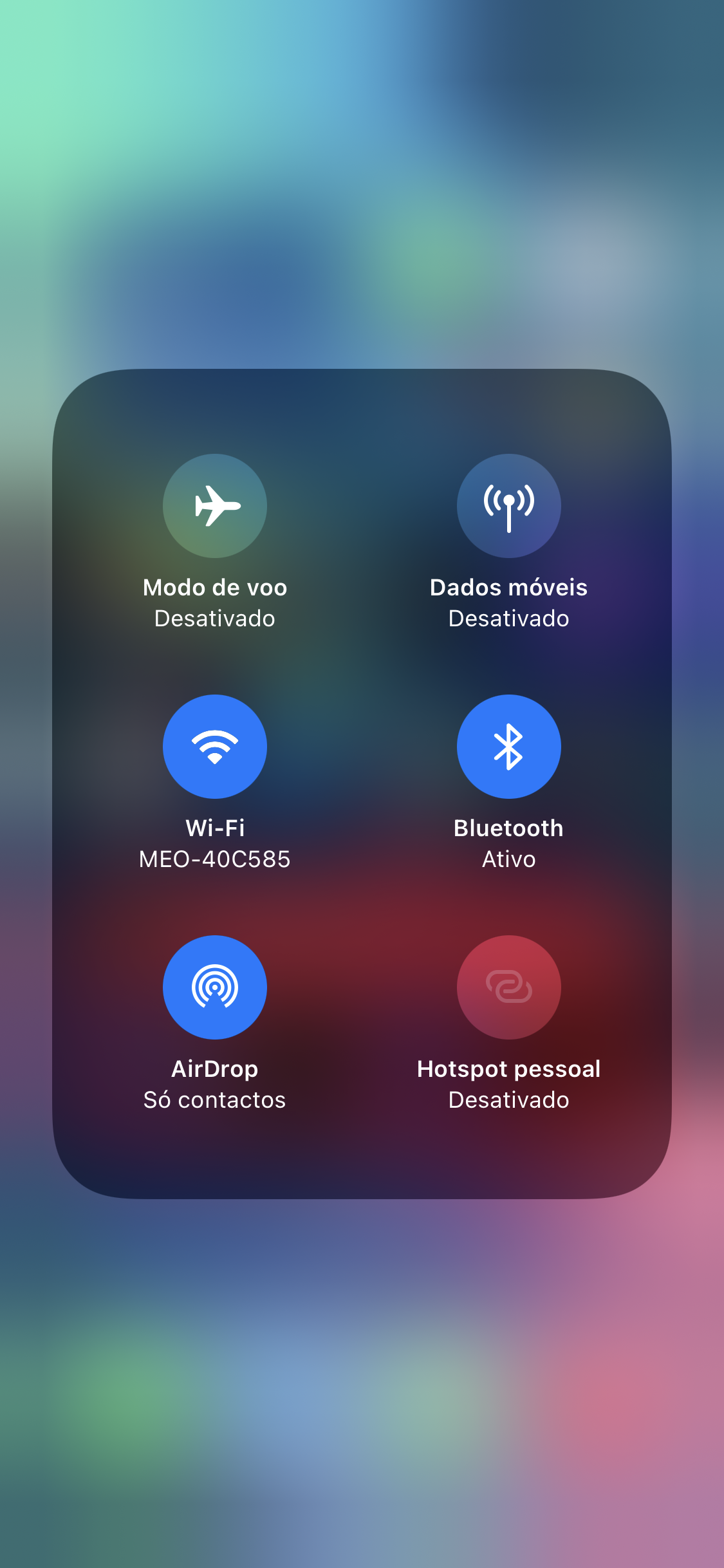 Como alternativa podes gerir estas informações a partir da Central de controlo, basta para isso pressionar e segurar o botão das redes (o mesmo que usas para ligar uma rede Wi-Fi) e seguidamente efetuar o mesmo procedimento no botão do AirDrop.