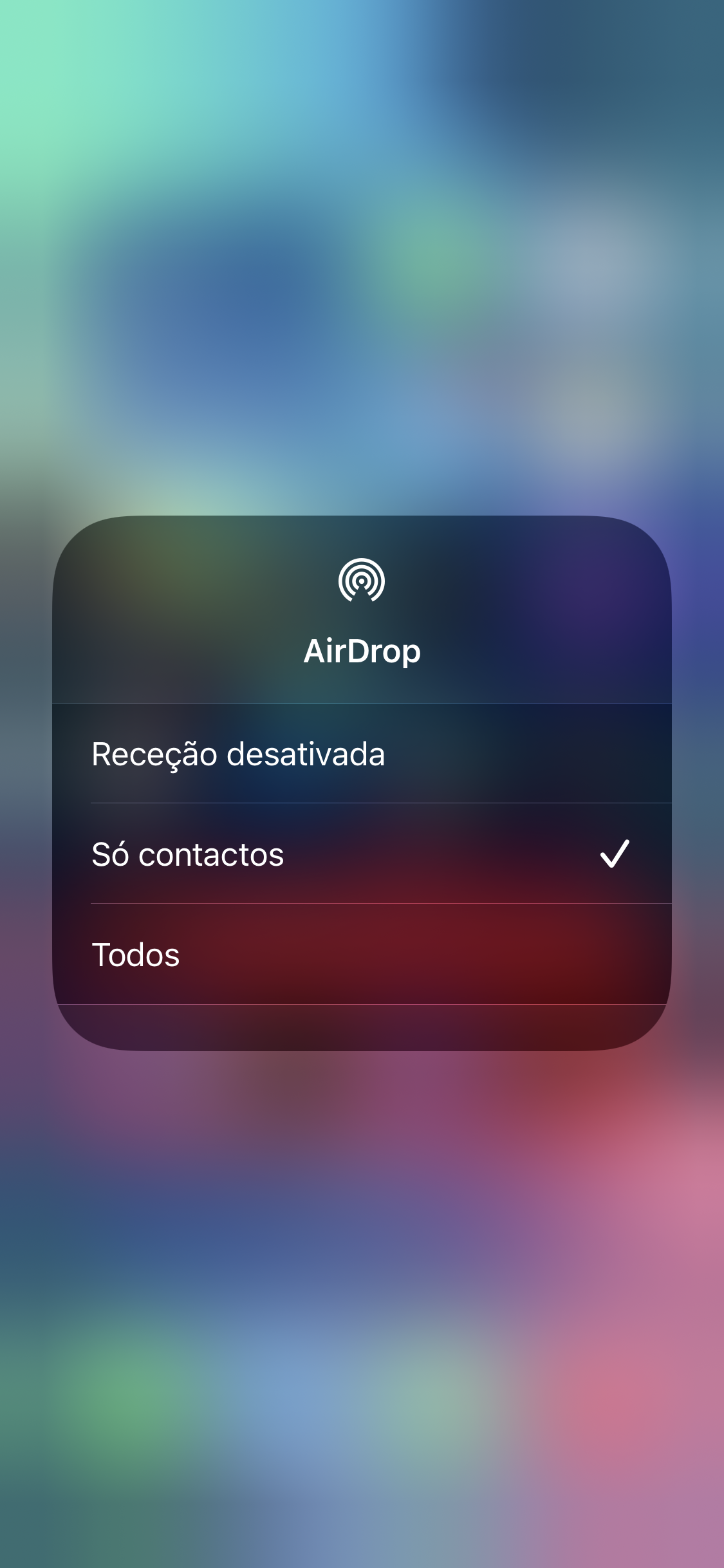 A primeira opção desabilita a receção de qualquer conteúdo via AirDrop, contudo permite enviar. A segunda é a mais aconselhada, permite a receção de conteúdo da tua lista de contactos ou de outros dispositivos com o teu Apple ID, limitando assim a origem a um grupo mais restrito e, à partida, confiável. Por fim, a opção Todos habilita a receção a todos que queiram enviar algo, conhecidos ou não, o que por vezes pode ser um incómodo.