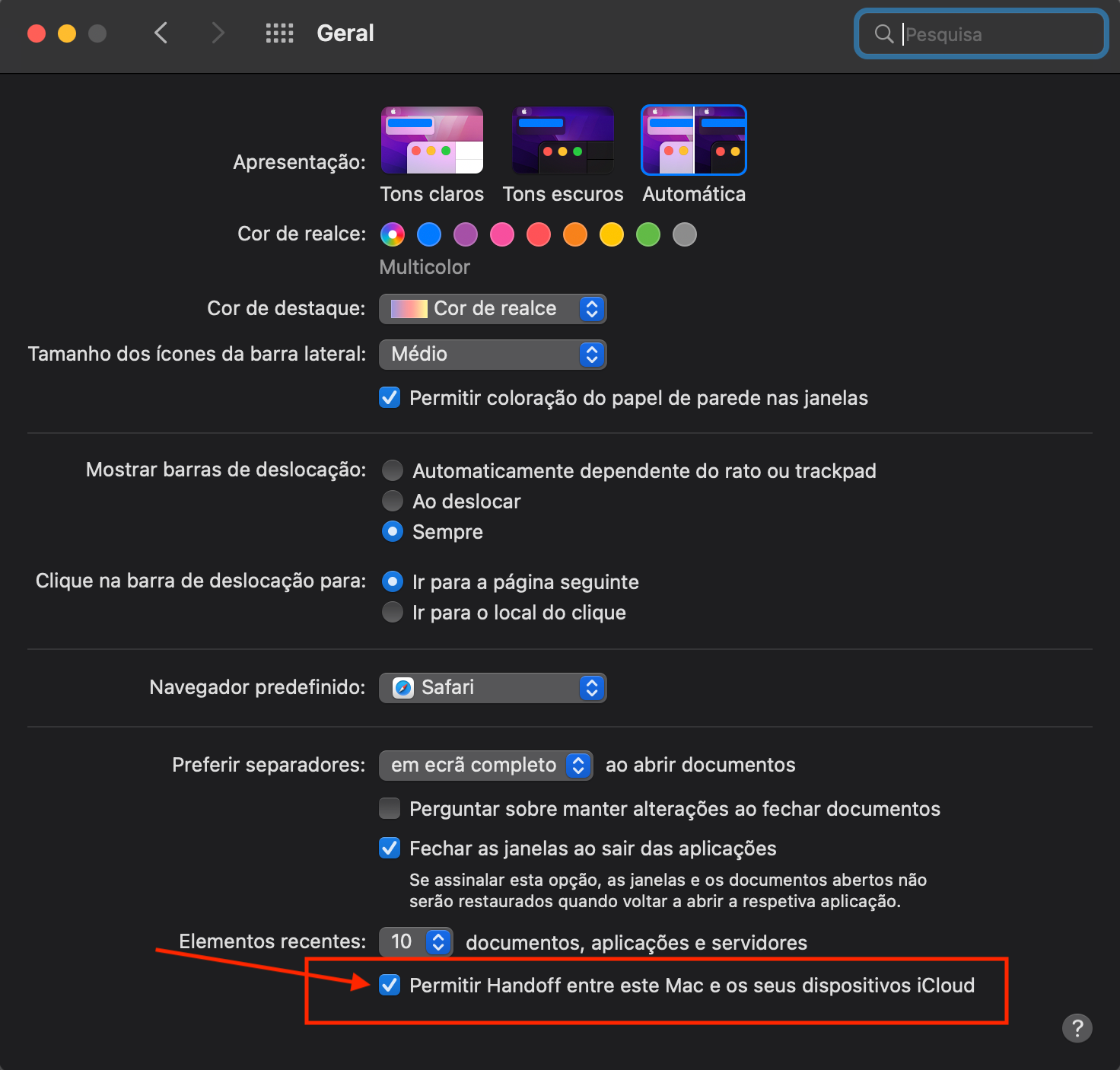 - Coloca o visto no quadrado "Permitir Handoff entre este Mac e os seus dispositivos iCloud".