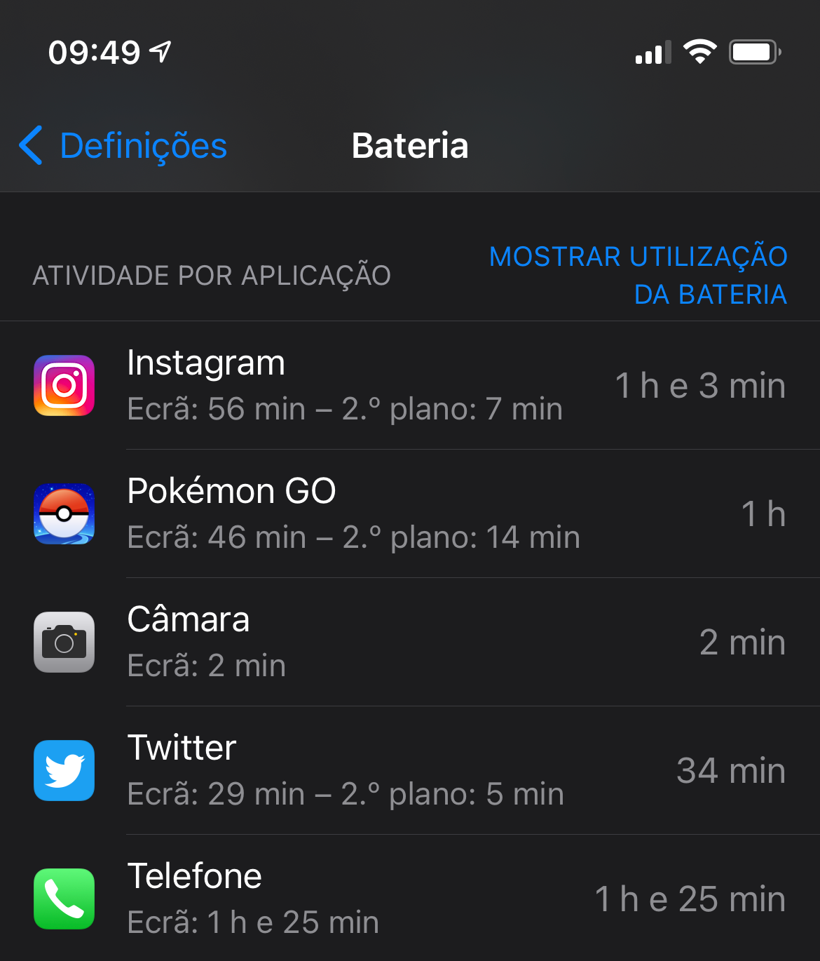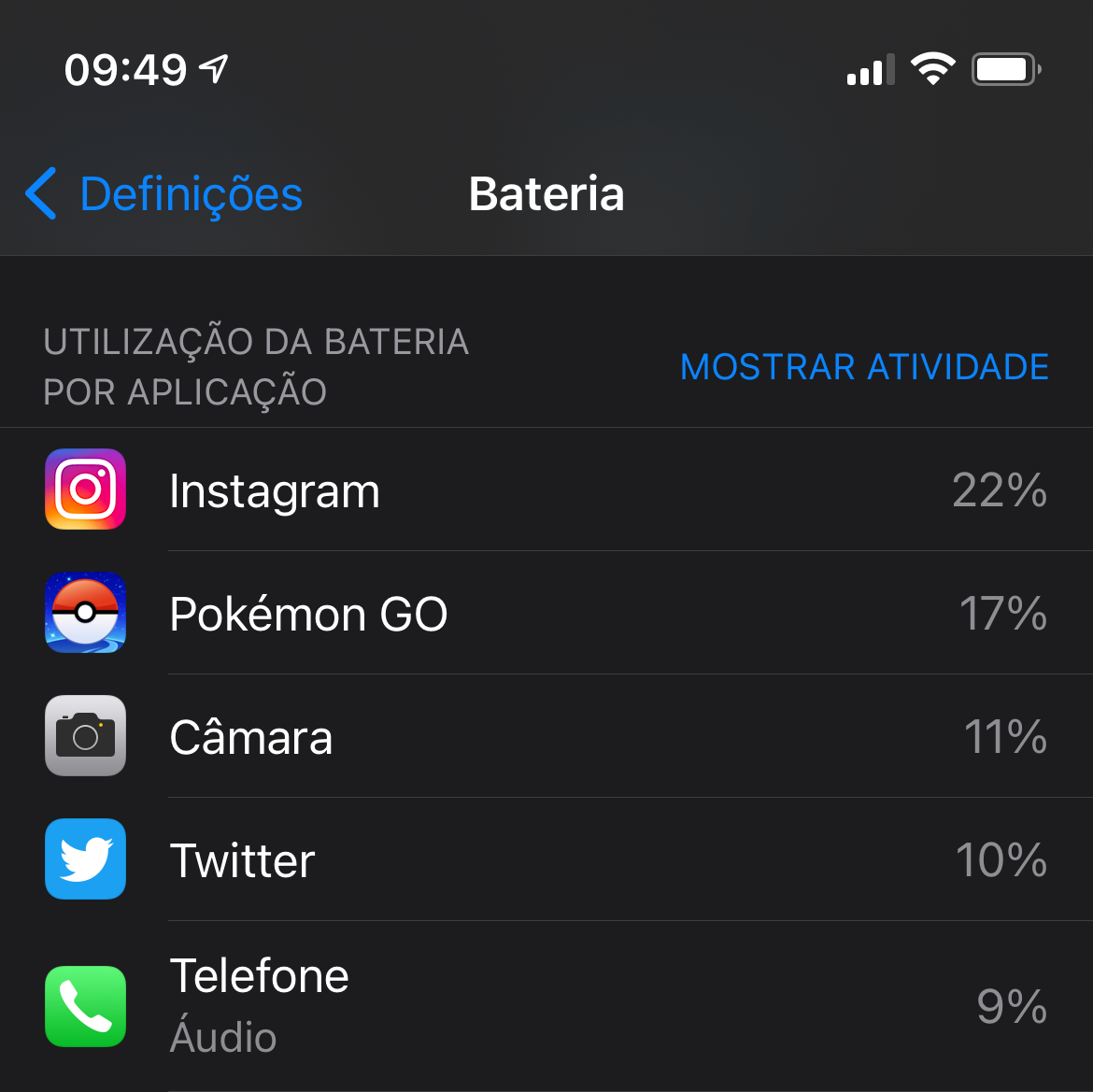 Ao deslizar para baixo nessa mesma janela, é mostrado também o consumo de energia por aplicação. Assim, poderás saber que aplicações estão a drenar a tua bateria. Ao clicar em "Mostrar atividade", é apresentado o tempo em horas e minutos que essas aplicações estiveram a consumir em tempo de ecrã. Quando clicares nesse mesmo botão, o nome do mesmo muda para "Mostrar utilização da bateria", para que possas voltar a visualizar a percentagem de bateria gasta por aplicação.