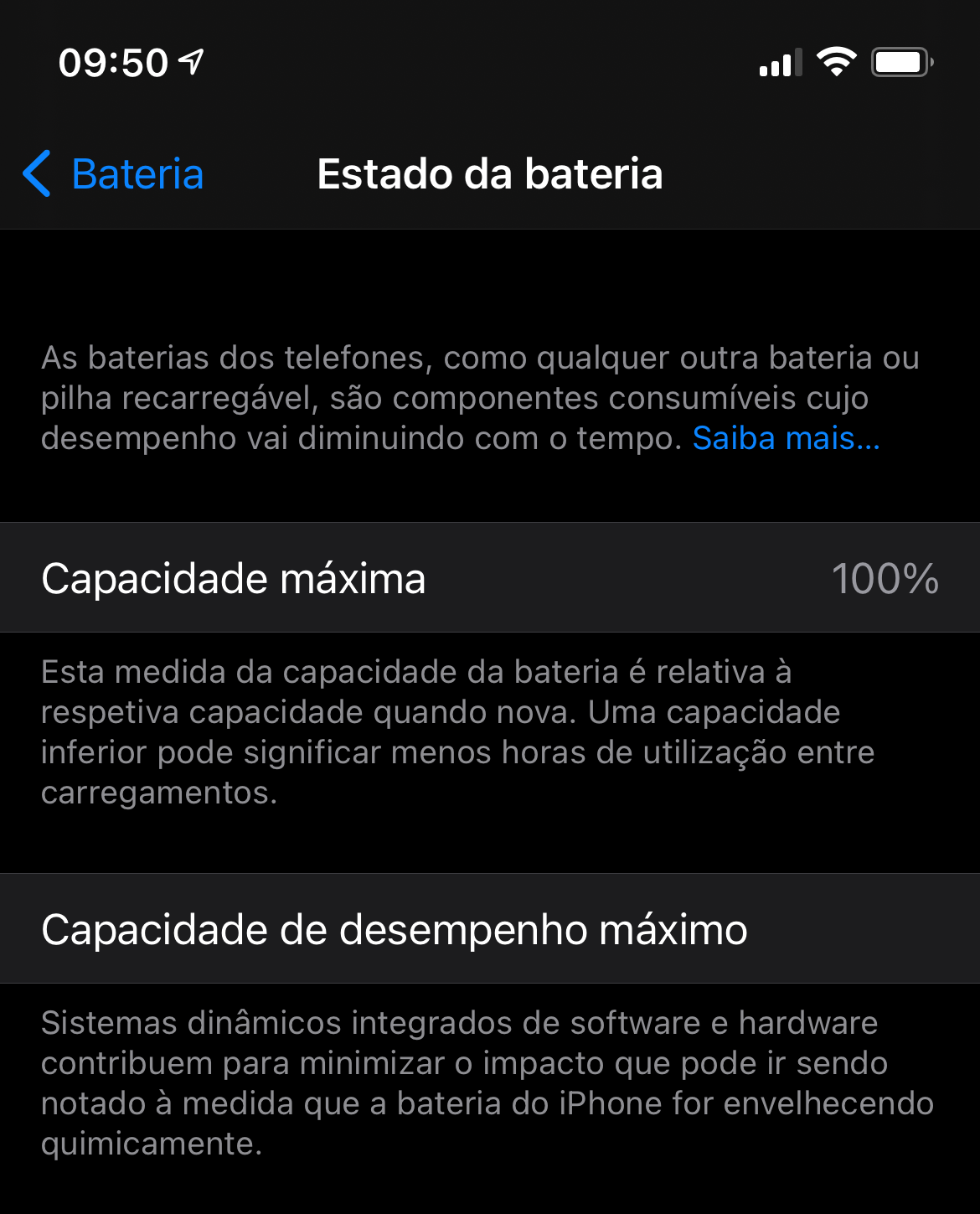 A ajudar na monitorização da saúde da bateria, também na mesma página das definições, encontrarás o botão "Estado da bateria". Aqui, é-te mostrada a capacidade máxima de carga de bateria, em comparação com a capacidade de carga de quando a mesma era nova. Quanto menor for o valor de percentagem, piores as condições em que a bateria se encontra no que toca ao armazenamento de energia.
