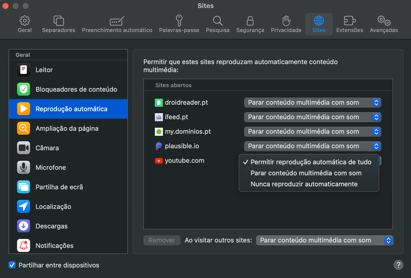 - Permitir reprodução automática de tudo, se quiseres manter a reprodução automática no site em questão;