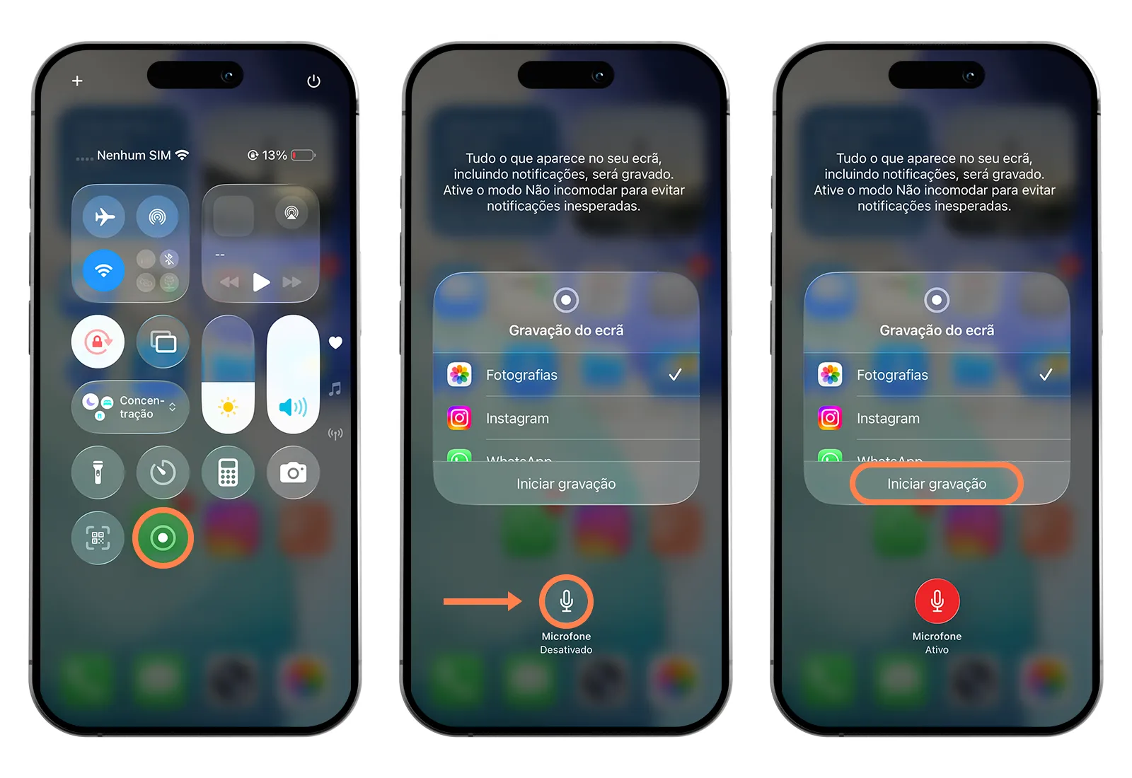 - Pressiona prolongadamente o botão de gravação de ecrã (se ainda não tens este botão na Central de controlo, podes adicioná-lo através do botão "+" que se encontra no mesmo ecrã, no canto superior esquerdo)