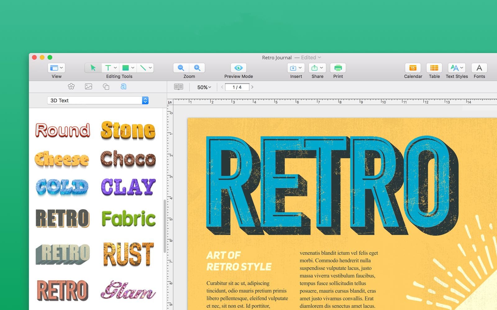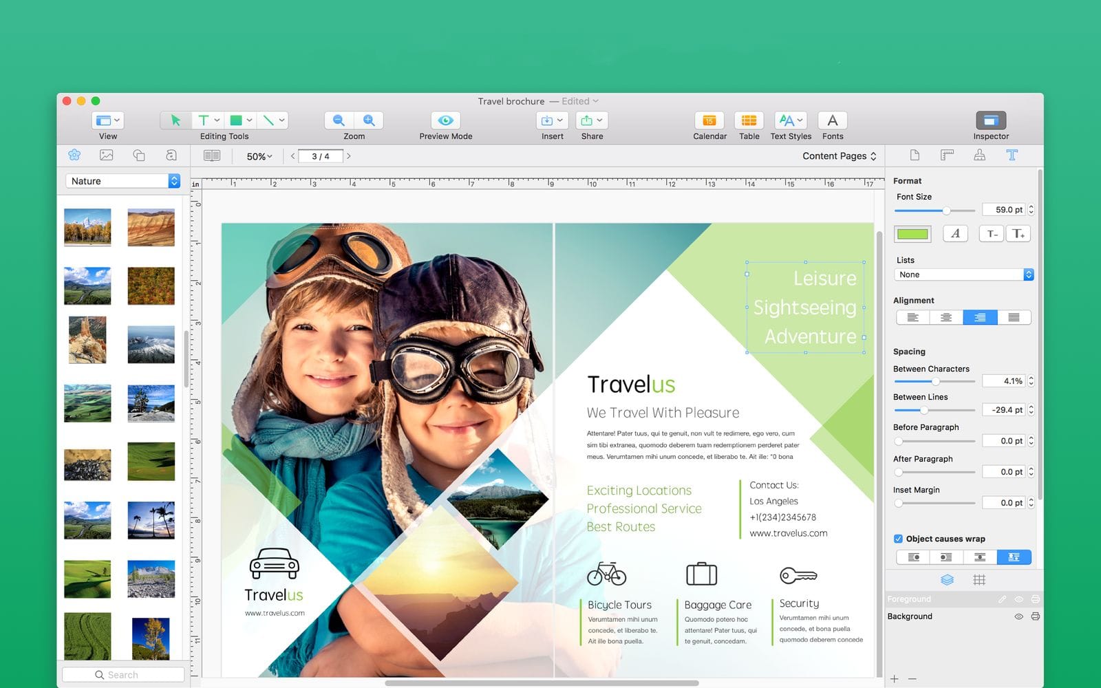 Spreads de duas páginas: com a Swift Publisher para Mac podes visualizar e editar duas páginas lado a lado. Esta funcionalidade é muito conveniente para quem deseja trabalhar com revistas, jornais e outros layouts de página espelhada.