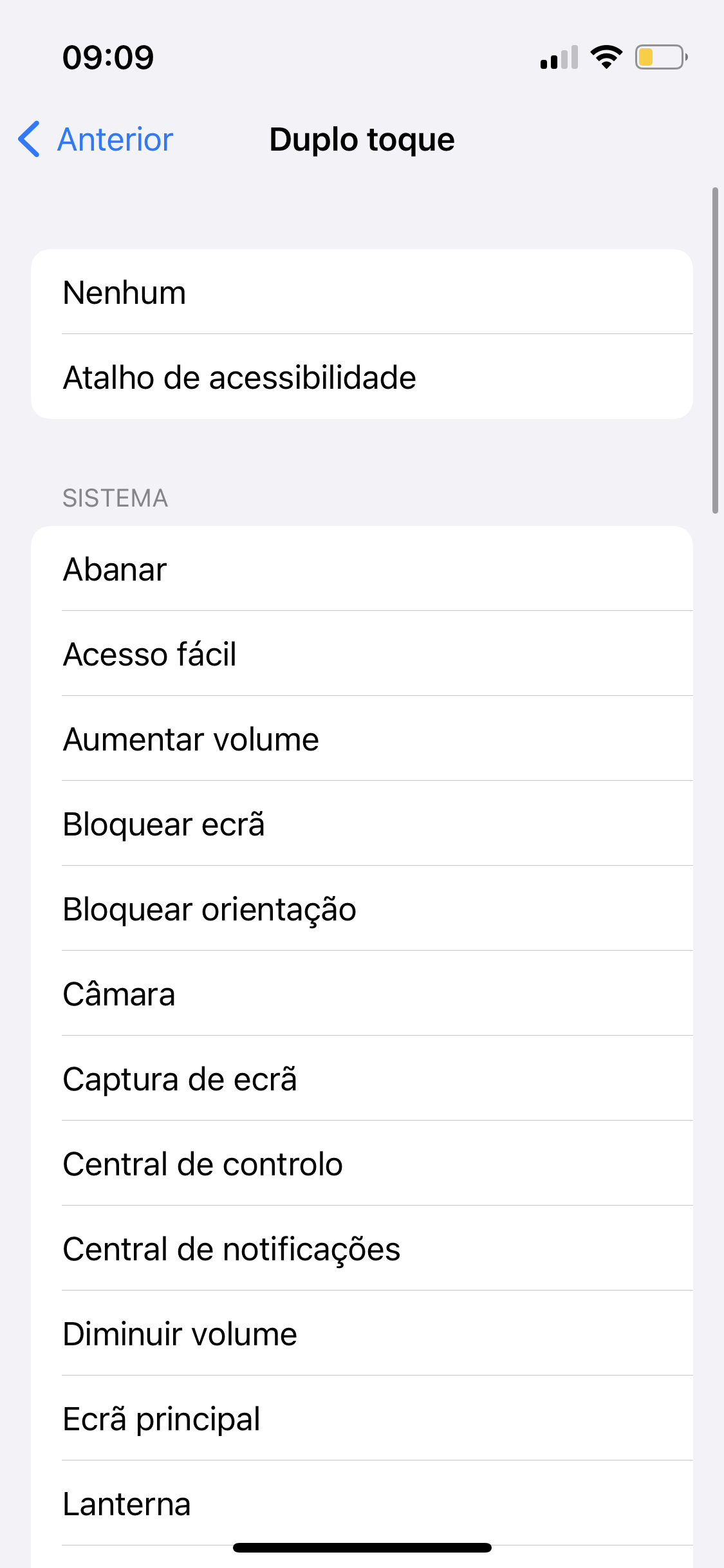 - Seleciona Toque Duplo ou Toque Triplo para definires a ação a ser acionada - se escolheres a primeira tens de dar dois toques na traseira do iPhone para ativar a ação, se escolheres a segunda tens de ativar a ação pretendida com três toques na traseira.