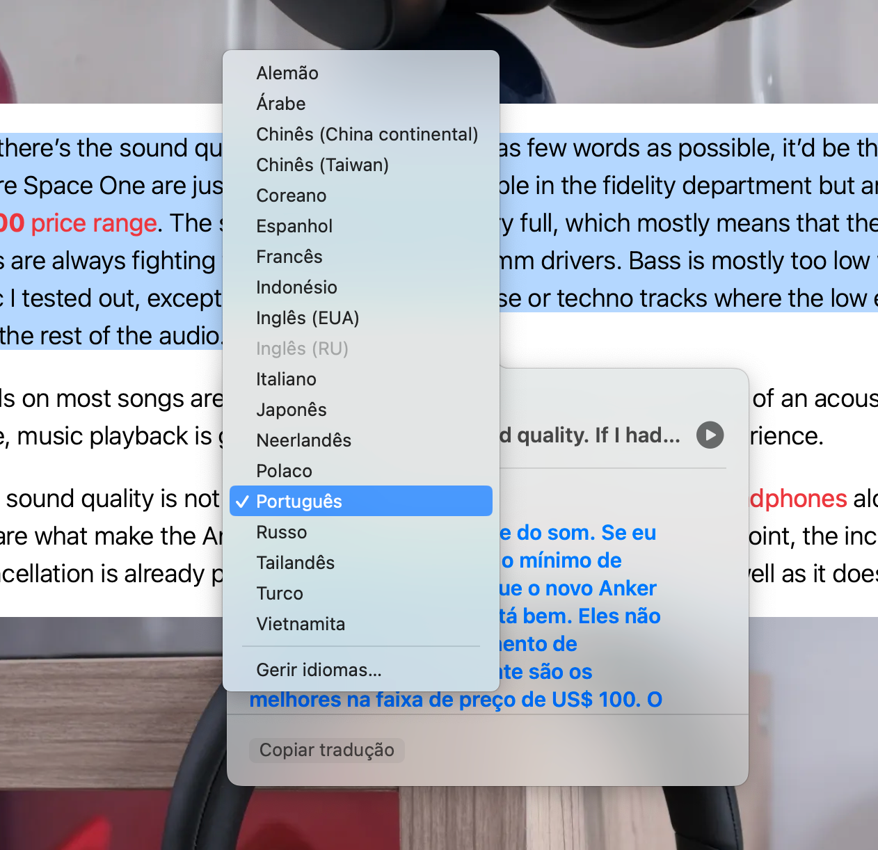 - Nos menus pop-up, escolhe o idioma para o qual pretendes traduzir;