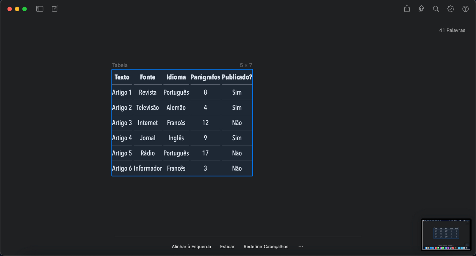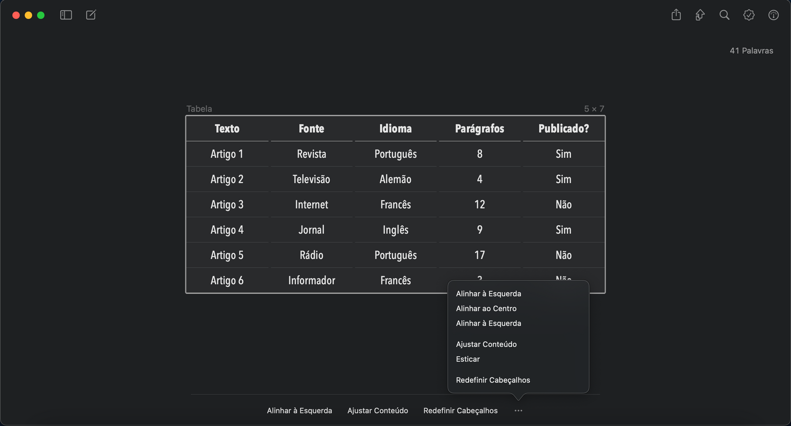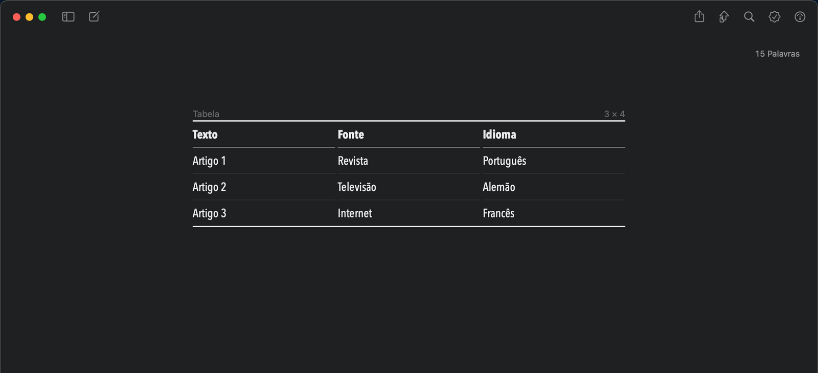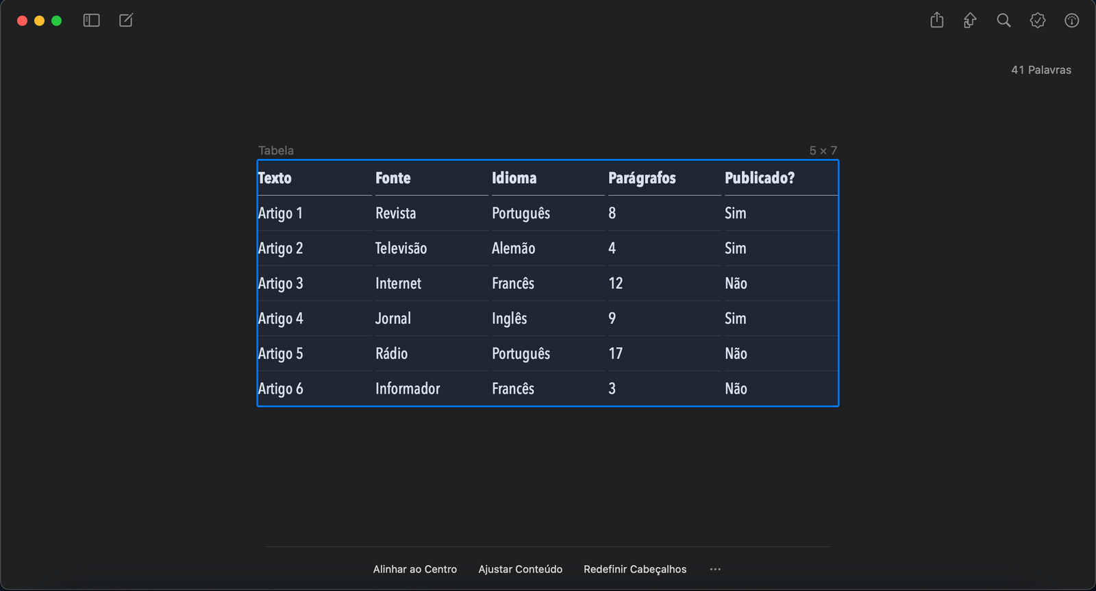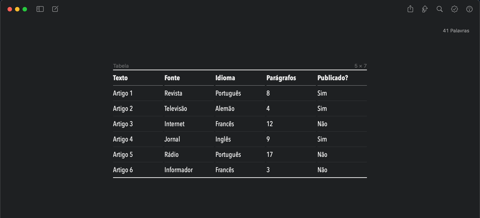 Mas as opções não ficam por aqui: isto foi só uma pequena amostra daquilo que a Ulysses, enquanto ferramenta de edição e criação de texto, consegue fazer no que a tabelas diz respeito. É possível também alterar os tamanhos das linhas e das colunas, formatar tipos de letra de cabeçalhos e conteúdo, adicionar títulos, etc.