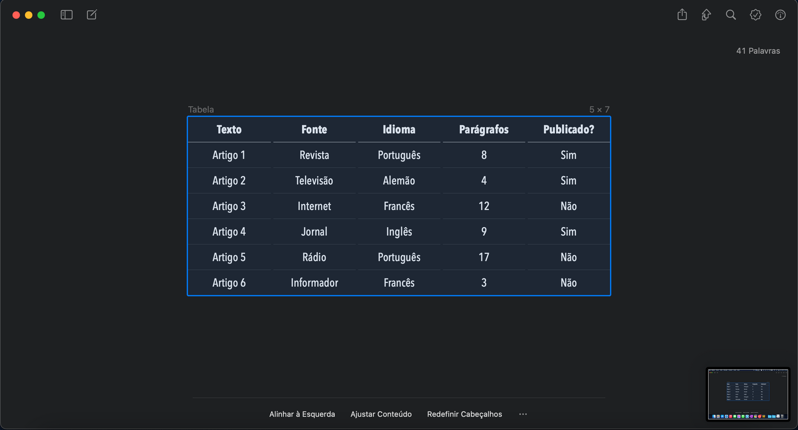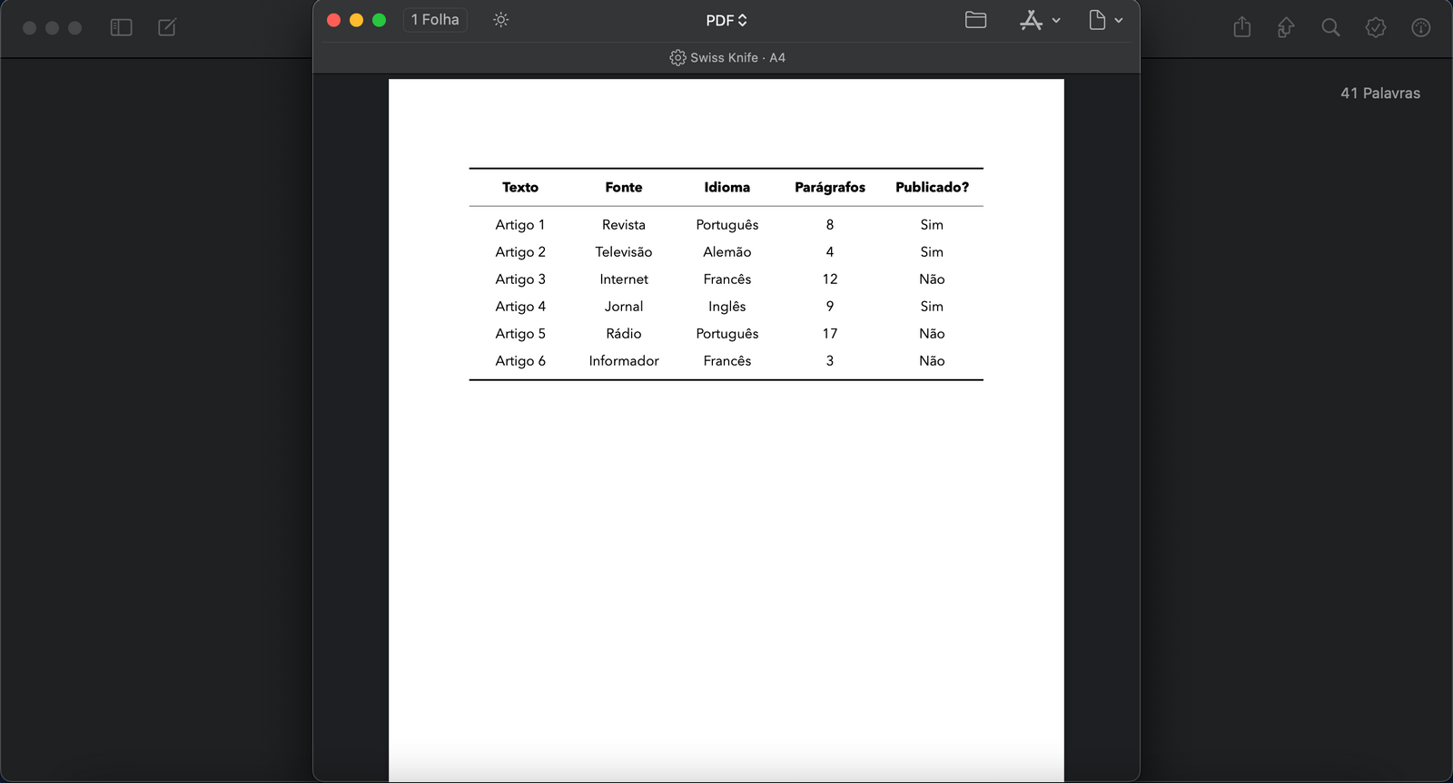 Quando a tabela estiver totalmente preenchida e formatada a gosto, podemos ver como irá a mesma aparecer através da opção de pré-visualização da exportação.